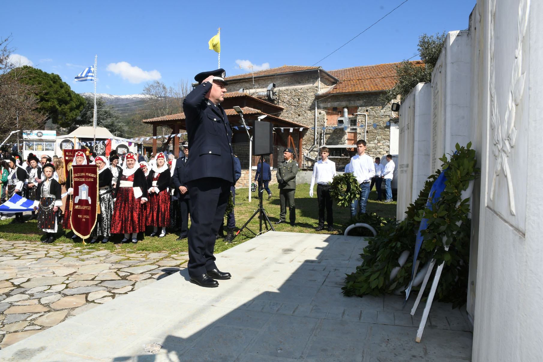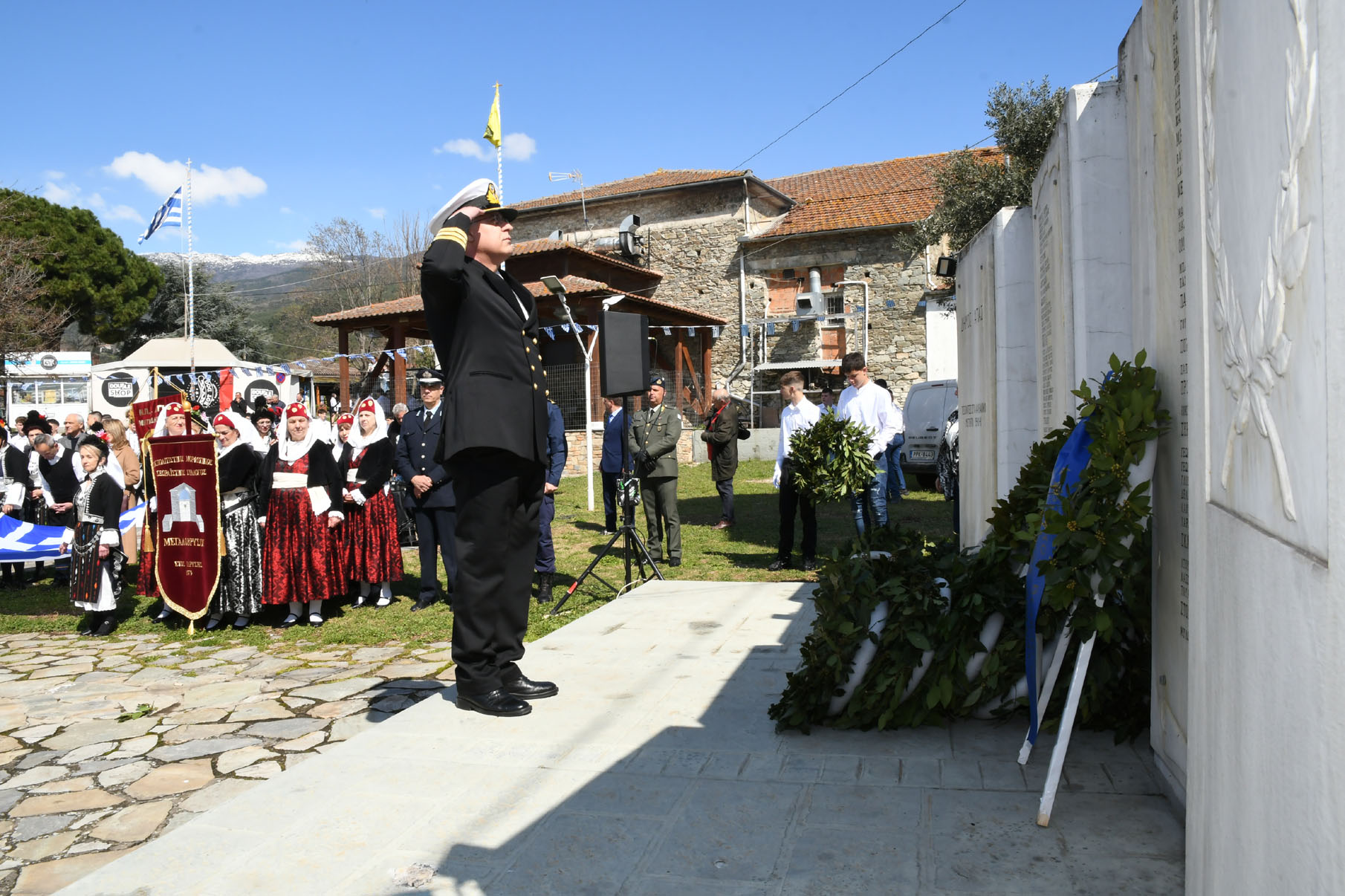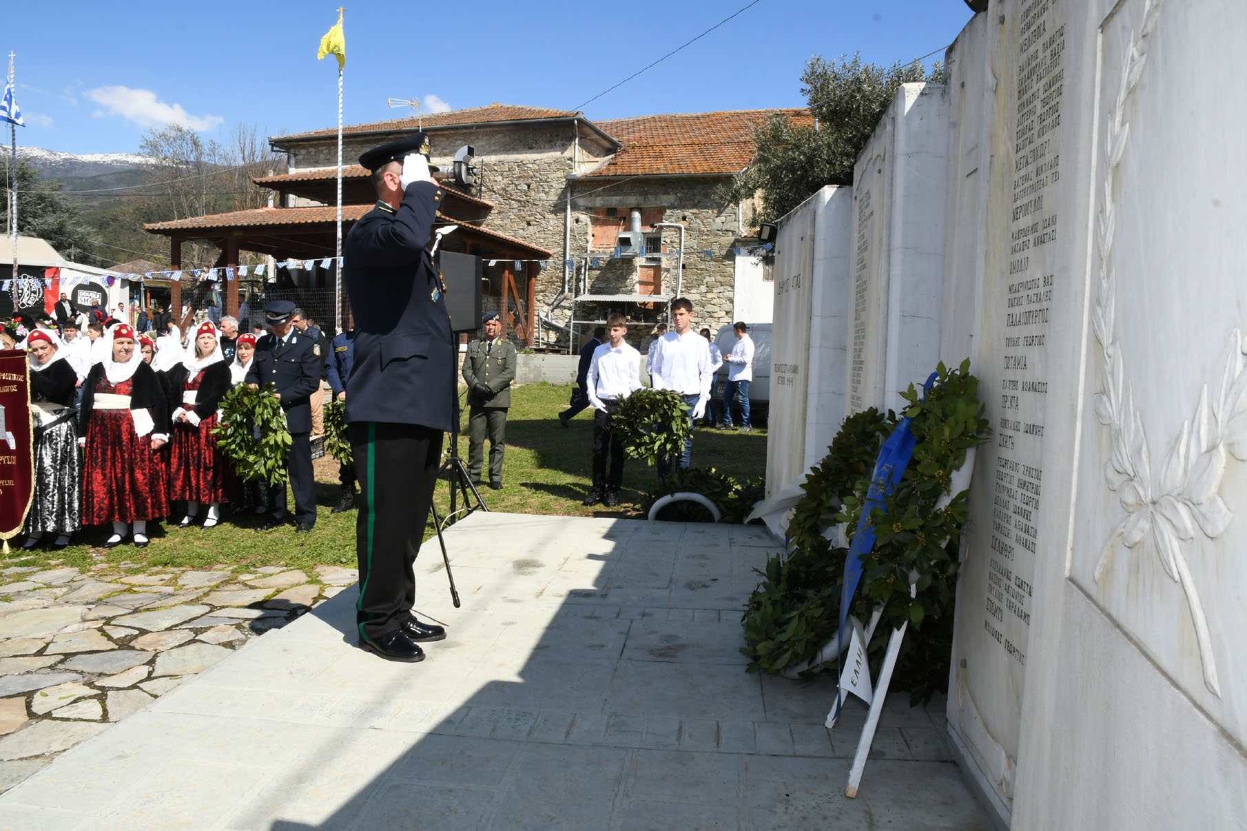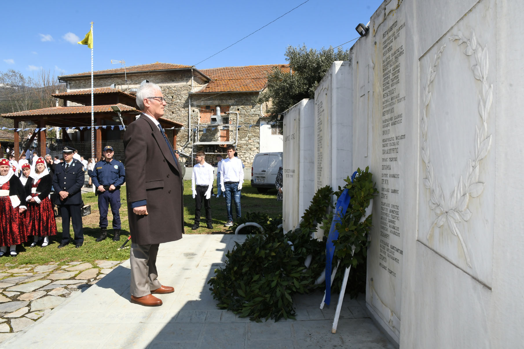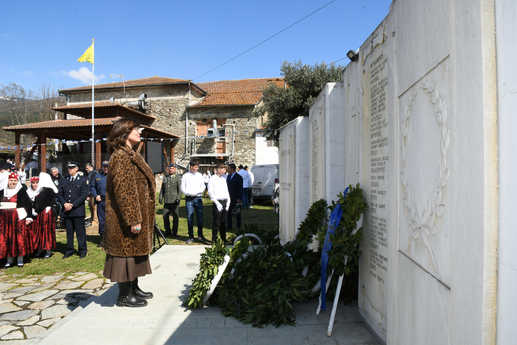 Της ομιλίας ακολούθησε επιμνημόσυνη δέηση στο Μνημείο των Πεσόντων Αγωνιστών, όπου ακούστηκε ο Εθνικός μας Ύμνος, κρατήθηκε ενός λεπτού σιγή και κατατέθηκαν στεφάνια από τον αντιπεριφερειάρχη Αθλητισμού και Πολιτισμού Σωτήριο Σουλούκο, από τον δήμαρχο Αγιάς Αντώνη Γκουντάρα, από τον κ. Γεώργιο Γουργιώτη, πρόεδρο της Δημοτικής Οργάνωσης Αγιάς της Νέας Δημοκρατίας, εκπροσωπώντας το κόμμα της Ν.Δ., από τον κ. Αθανάσιο Παλιοβάιο, πολιτευτή, εκπροσωπώντας το κόμμα «Ελληνική Λύση – Κυριάκος Βελόπουλος», από τον αντισυνταγματάρχη Πάνο Ηλία εκ μέρους των Ενόπλων Δυνάμεων, από τον διοικητή του Αστυνομικού Τμήματος Αγιάς Μιχάλη Κουπατσιάρα, από τον κ. Παντελή Βαλιάντζα εκπροσωπώντας το Πυροσβεστικό Κλιμάκιο Αγιάς, από τον υποδιοικητή του Λιμενικού Σταθμού Αγιοκάμπου Ανδρέα Λουλούδη, από τον τοπικό σύμβουλο της Δημοτικής Κοινότητας Αγιάς Ζάχο Μπατζιόλα για την Εθνική Αντίσταση, από τον διευθυντή του 2ου Δημοτικού Σχολείου Αγιάς Αθανάσιο Δεληζώνα εκ μέρους της Πρωτοβάθμιας Εκπαίδευσης, από την διευθύντρια του Γενικού Λυκείου Αγιάς Βικτώρια Δημητρίου εκ μέρους της Δευτεροβάθμιας Εκπαίδευσης, από τον κ. Αθανάσιο Μακρή ως εκπρόσωπο του 1ου Συστήματος Προσκόπων Αγιάς και από τον κ. Θεόδωρο Μαλαχτάρη εκ μέρους του Μορφωτικού Πολιτιστικού Συλλόγου Αγιωτών «Μιλτιάδης Δάλλας».