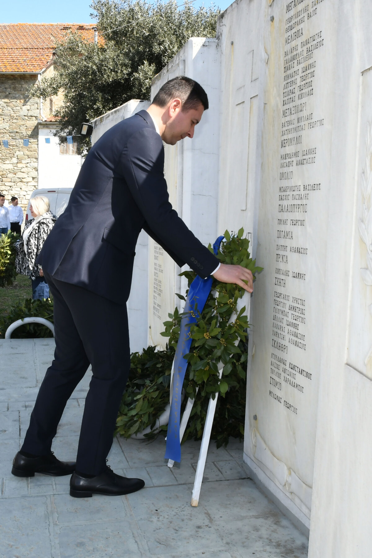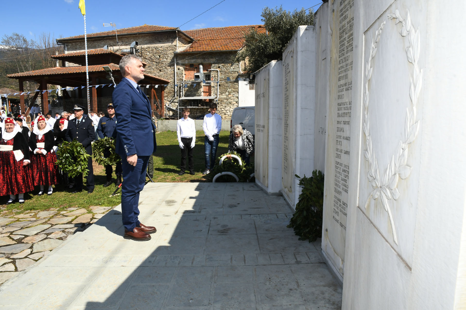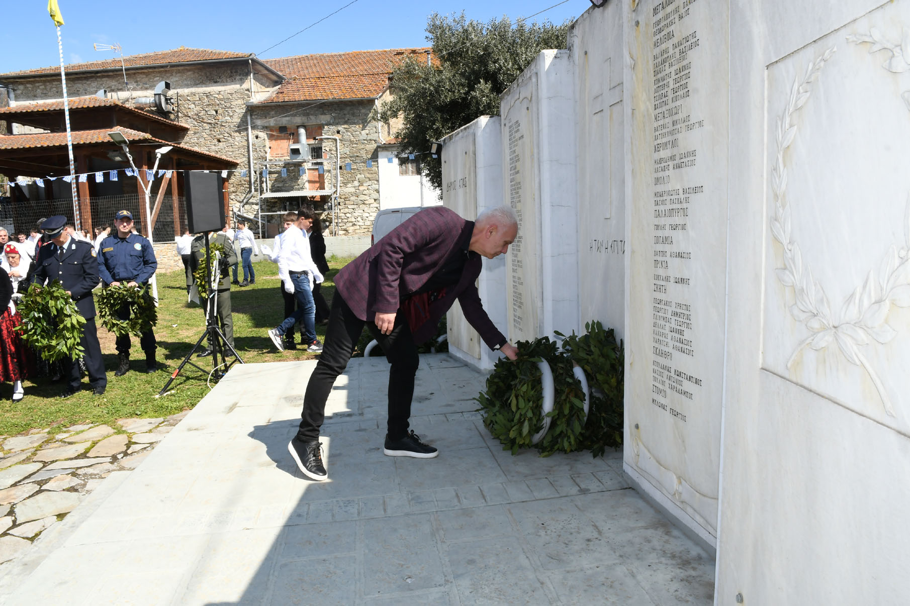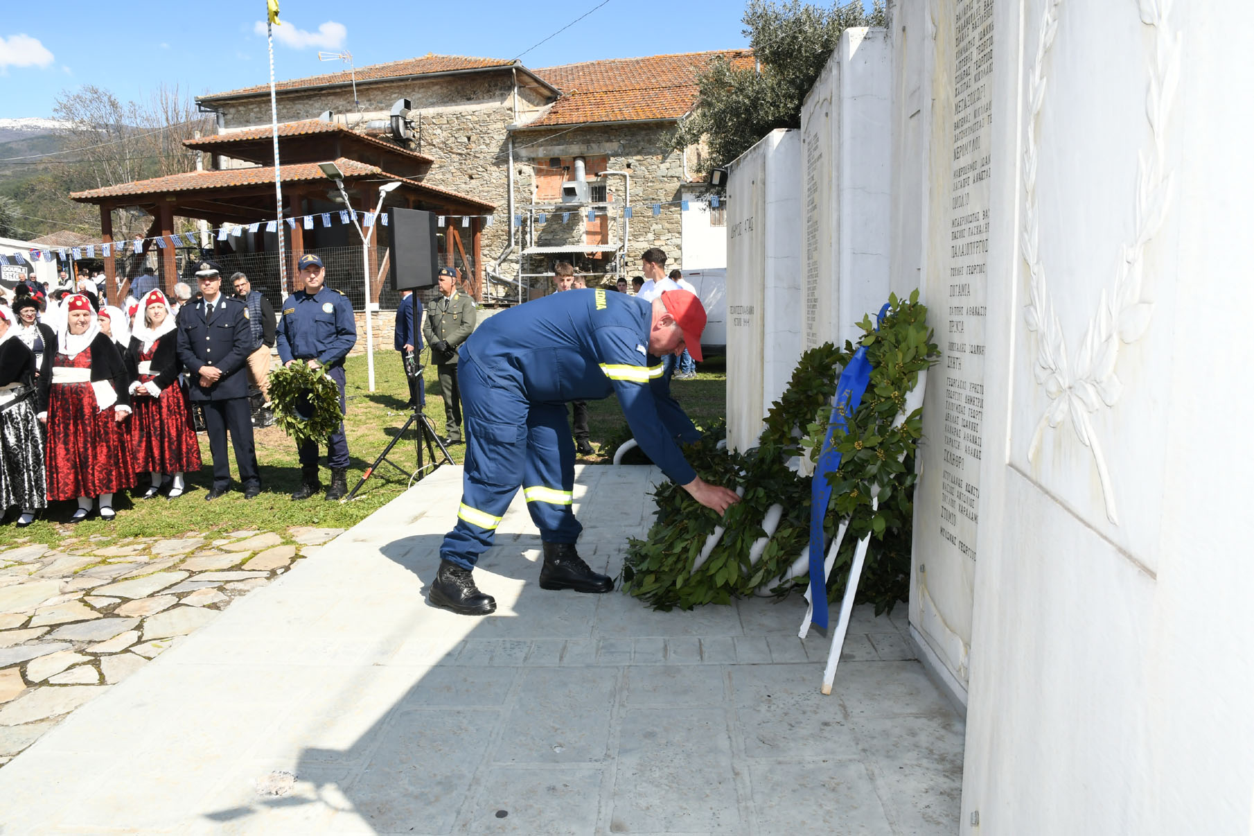 Της ομιλίας ακολούθησε επιμνημόσυνη δέηση στο Μνημείο των Πεσόντων Αγωνιστών, όπου ακούστηκε ο Εθνικός μας Ύμνος, κρατήθηκε ενός λεπτού σιγή και κατατέθηκαν στεφάνια από τον αντιπεριφερειάρχη Αθλητισμού και Πολιτισμού Σωτήριο Σουλούκο, από τον δήμαρχο Αγιάς Αντώνη Γκουντάρα, από τον κ. Γεώργιο Γουργιώτη, πρόεδρο της Δημοτικής Οργάνωσης Αγιάς της Νέας Δημοκρατίας, εκπροσωπώντας το κόμμα της Ν.Δ., από τον κ. Αθανάσιο Παλιοβάιο, πολιτευτή, εκπροσωπώντας το κόμμα «Ελληνική Λύση – Κυριάκος Βελόπουλος», από τον αντισυνταγματάρχη Πάνο Ηλία εκ μέρους των Ενόπλων Δυνάμεων, από τον διοικητή του Αστυνομικού Τμήματος Αγιάς Μιχάλη Κουπατσιάρα, από τον κ. Παντελή Βαλιάντζα εκπροσωπώντας το Πυροσβεστικό Κλιμάκιο Αγιάς, από τον υποδιοικητή του Λιμενικού Σταθμού Αγιοκάμπου Ανδρέα Λουλούδη, από τον τοπικό σύμβουλο της Δημοτικής Κοινότητας Αγιάς Ζάχο Μπατζιόλα για την Εθνική Αντίσταση, από τον διευθυντή του 2ου Δημοτικού Σχολείου Αγιάς Αθανάσιο Δεληζώνα εκ μέρους της Πρωτοβάθμιας Εκπαίδευσης, από την διευθύντρια του Γενικού Λυκείου Αγιάς Βικτώρια Δημητρίου εκ μέρους της Δευτεροβάθμιας Εκπαίδευσης, από τον κ. Αθανάσιο Μακρή ως εκπρόσωπο του 1ου Συστήματος Προσκόπων Αγιάς και από τον κ. Θεόδωρο Μαλαχτάρη εκ μέρους του Μορφωτικού Πολιτιστικού Συλλόγου Αγιωτών «Μιλτιάδης Δάλλας».