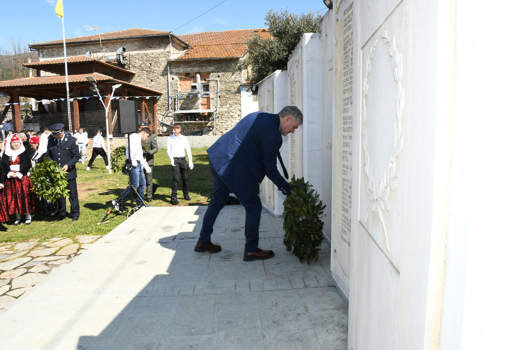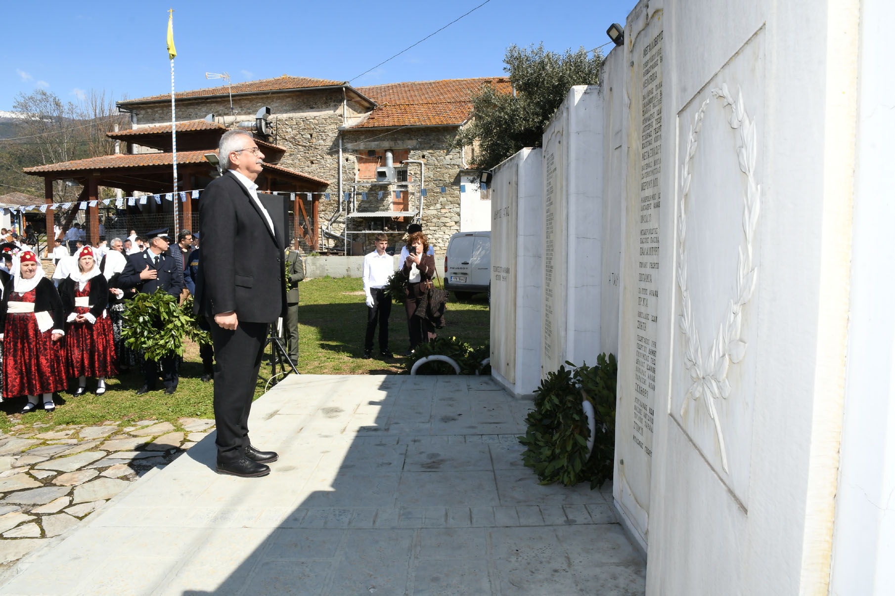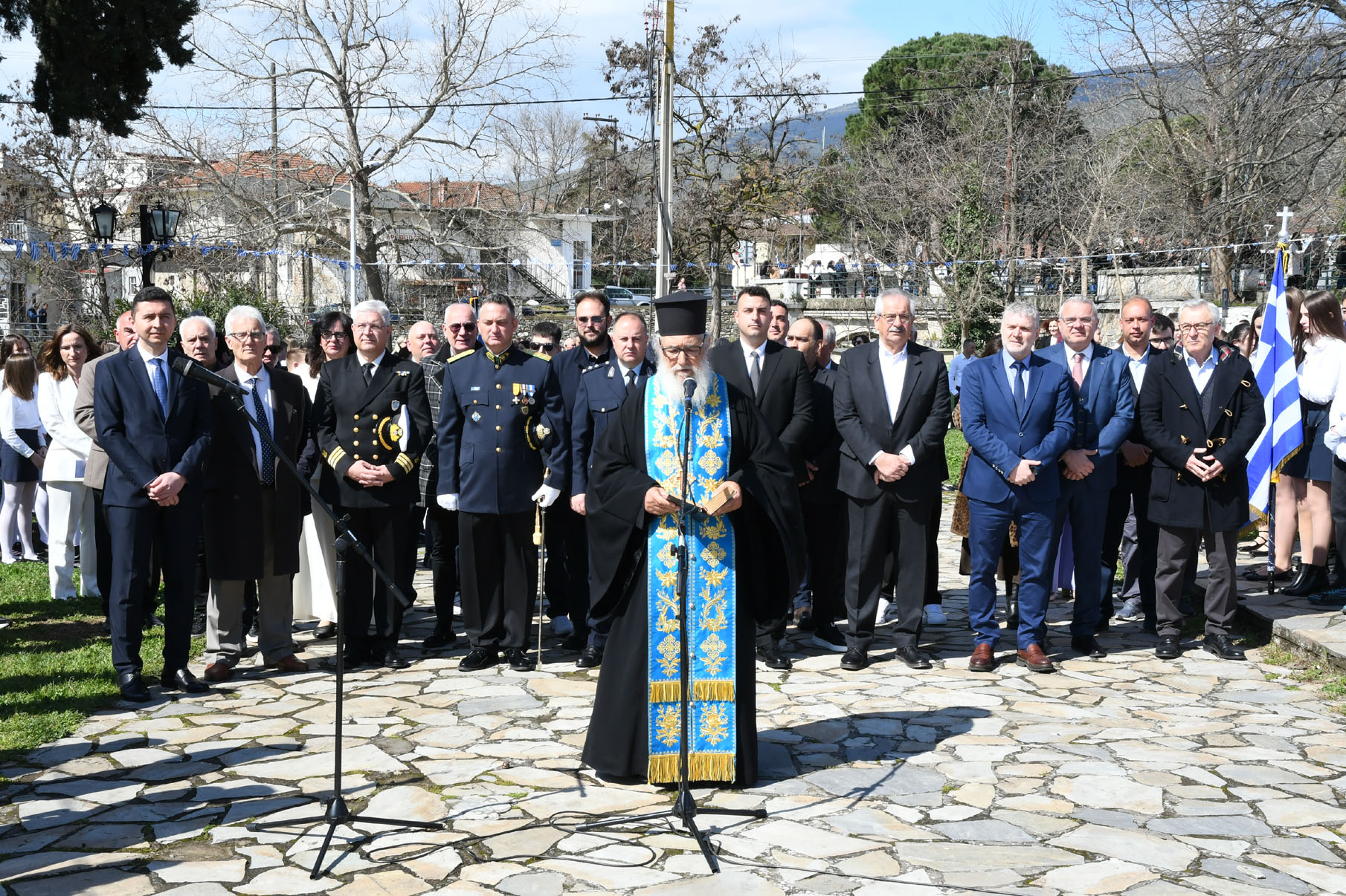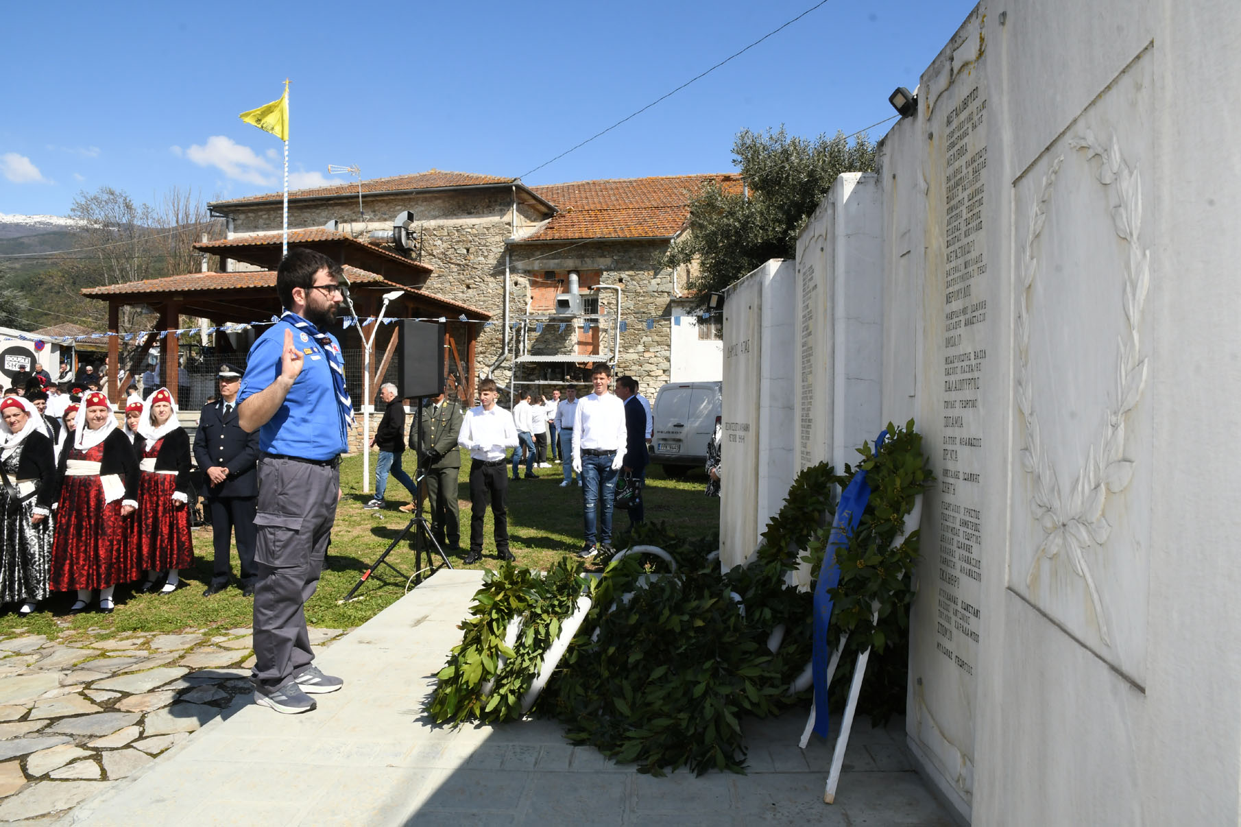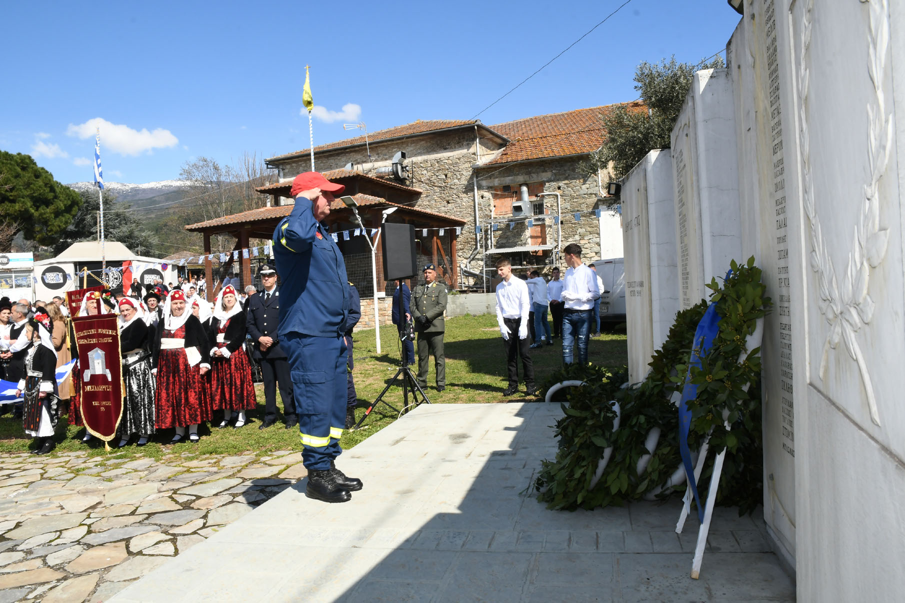 Της ομιλίας ακολούθησε επιμνημόσυνη δέηση στο Μνημείο των Πεσόντων Αγωνιστών, όπου ακούστηκε ο Εθνικός μας Ύμνος, κρατήθηκε ενός λεπτού σιγή και κατατέθηκαν στεφάνια από τον αντιπεριφερειάρχη Αθλητισμού και Πολιτισμού Σωτήριο Σουλούκο, από τον δήμαρχο Αγιάς Αντώνη Γκουντάρα, από τον κ. Γεώργιο Γουργιώτη, πρόεδρο της Δημοτικής Οργάνωσης Αγιάς της Νέας Δημοκρατίας, εκπροσωπώντας το κόμμα της Ν.Δ., από τον κ. Αθανάσιο Παλιοβάιο, πολιτευτή, εκπροσωπώντας το κόμμα «Ελληνική Λύση – Κυριάκος Βελόπουλος», από τον αντισυνταγματάρχη Πάνο Ηλία εκ μέρους των Ενόπλων Δυνάμεων, από τον διοικητή του Αστυνομικού Τμήματος Αγιάς Μιχάλη Κουπατσιάρα, από τον κ. Παντελή Βαλιάντζα εκπροσωπώντας το Πυροσβεστικό Κλιμάκιο Αγιάς, από τον υποδιοικητή του Λιμενικού Σταθμού Αγιοκάμπου Ανδρέα Λουλούδη, από τον τοπικό σύμβουλο της Δημοτικής Κοινότητας Αγιάς Ζάχο Μπατζιόλα για την Εθνική Αντίσταση, από τον διευθυντή του 2ου Δημοτικού Σχολείου Αγιάς Αθανάσιο Δεληζώνα εκ μέρους της Πρωτοβάθμιας Εκπαίδευσης, από την διευθύντρια του Γενικού Λυκείου Αγιάς Βικτώρια Δημητρίου εκ μέρους της Δευτεροβάθμιας Εκπαίδευσης, από τον κ. Αθανάσιο Μακρή ως εκπρόσωπο του 1ου Συστήματος Προσκόπων Αγιάς και από τον κ. Θεόδωρο Μαλαχτάρη εκ μέρους του Μορφωτικού Πολιτιστικού Συλλόγου Αγιωτών «Μιλτιάδης Δάλλας».