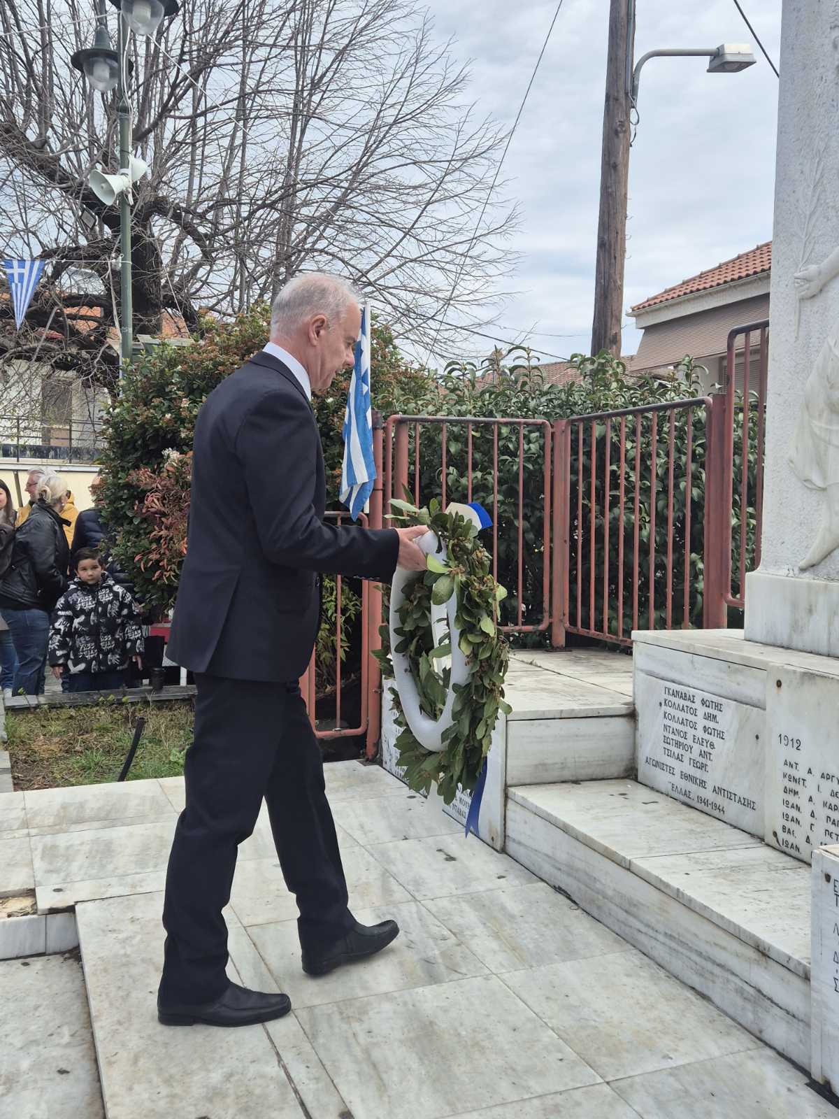 Μετά το πέρας της Δοξολογίας, κλήρος και λαός μετέβησαν στο Μνημείο των Πεσόντων, όπου τελέστηκε επιμνημόσυνη δέηση από τον Σεβασμιώτατο Μητροπολίτη κ. Ιερώνυμο και τον ιερέα της ενορίας, πατέρα Αλέξανδρο. Ακολούθησε η κατάθεση στεφάνων, η τήρηση ενός λεπτού σιγής και η ανάκρουση του Εθνικού Ύμνου. Την ευθύνη της τελετής ενώπιον του Μνημείου των Ηρώων είχε η υπάλληλος του Δήμου Τεμπών κα Περσεφόνη Ευαγγέλου.