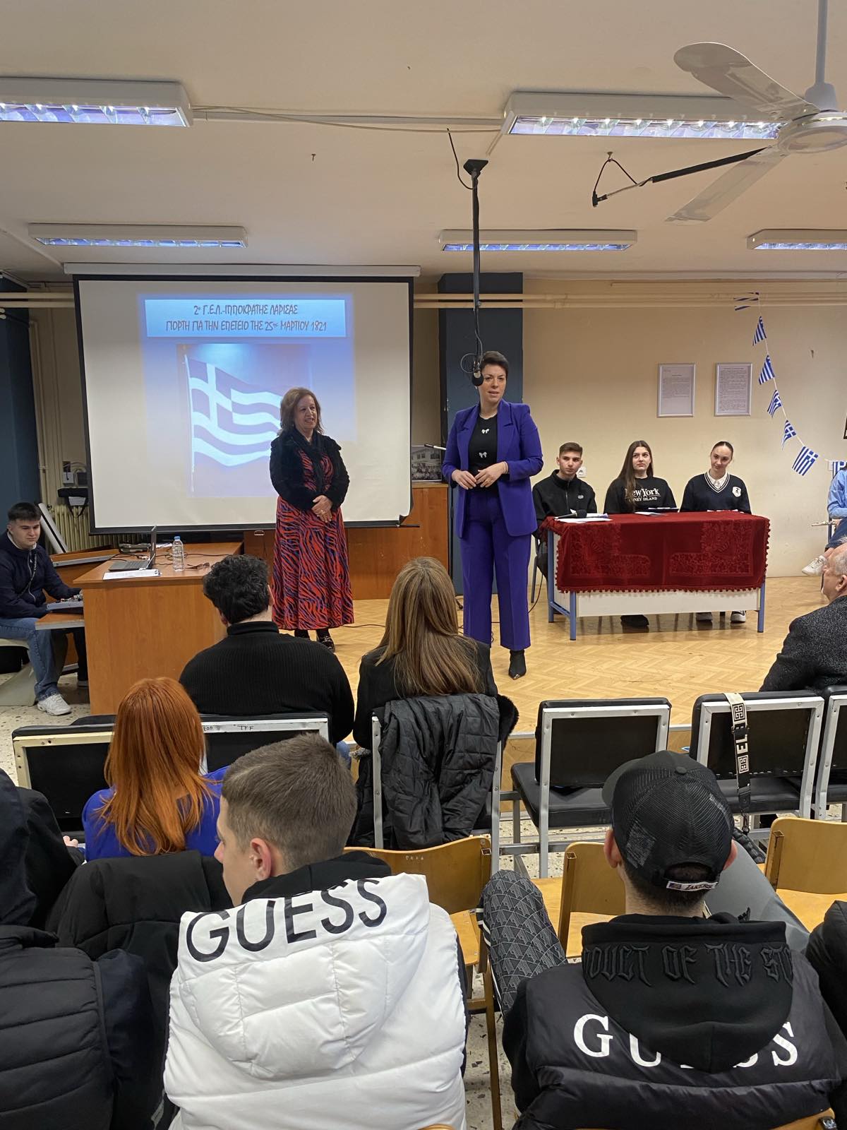 Η Διεθύντρια του 2ου ΓΕΛ-Ιπποκράτης, Μίνα Λίταινα, διαβίβασε χαιρετισμούς και ανέγνωσε τα εορταστικά μηνύματα για την εθνική επέτειο της 25ης Μαρτίου από την Υπουργό Παιδείας κ. Σοφία Ζαχαράκη, την Περιφερειακή Διευθύντρια Εκπ/σης Θεσσαλίας κ. Βασιλική Ζιάκα και τον Διευθυντή Β/θμιας Εκπ/σης Ν. Λάρισας κ. Νικόλαο Ζέρβα.