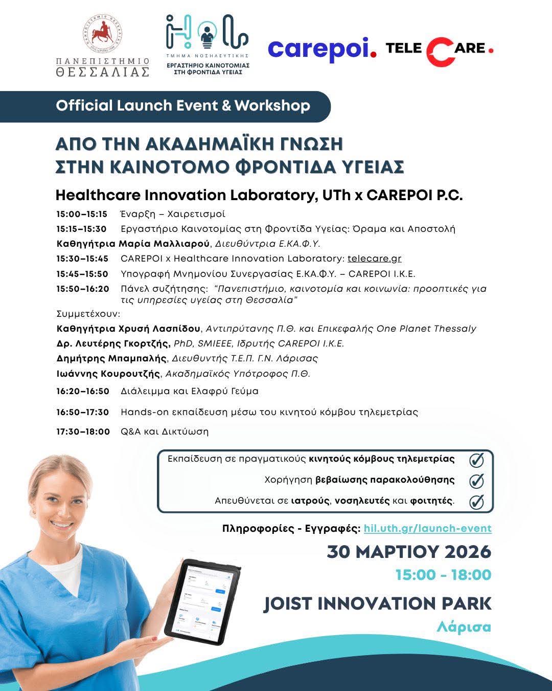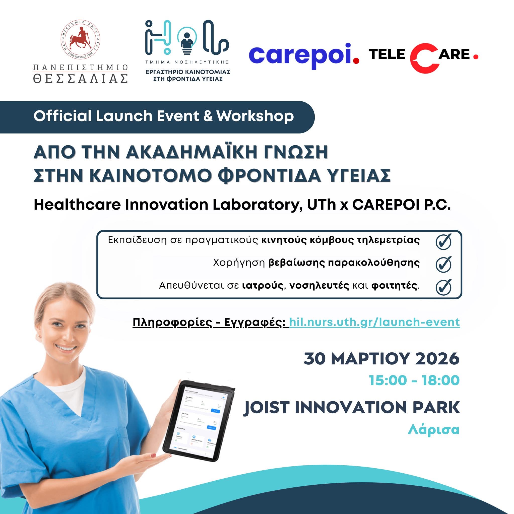 Το Εργαστήριο Καινοτομίας στη Φροντίδα Υγείας (Healthcare Innovation Laboratory) του Τμήματος Νοσηλευτικής του Πανεπιστημίου Θεσσαλίας, σε συνεργασία με την CAREPOI, διοργανώνει το Official Launch Event με τίτλο «Από την Ακαδημαϊκή Γνώση στην Καινοτόμο Φροντίδα Υγείας», τη Δευτέρα 30 Μαρτίου 2026 στη Λάρισα.