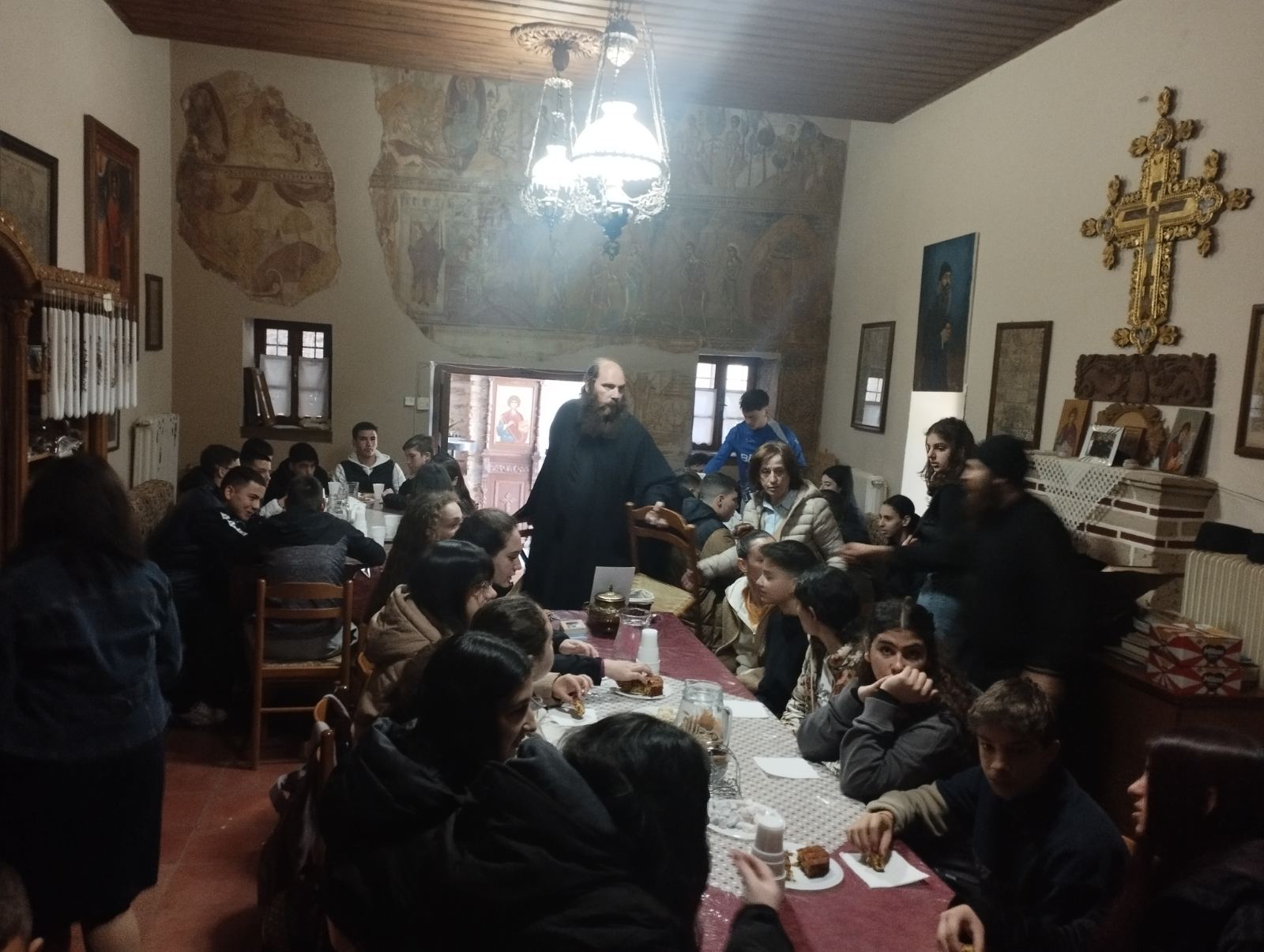 Μετά το πέρας της λειτουργίας, οι μαθητές γνώρισαν την εγκάρδια φιλοξενία της αδελφότητας της Μονής. Ο ηγούμενος, πατέρας Νικόδημος, τους υποδέχθηκε με ιδιαίτερη θέρμη, προσφέροντάς τους κεράσματα και αναμνηστικά δώρα. Η απλότητα, η καλοσύνη και η πνευματικότητα που εξέπεμπε άφησαν σε όλους τις καλύτερες εντυπώσεις, καθιστώντας την επίσκεψη αυτή μια αξέχαστη εμπειρία που συνδύασε τη γνώση με την πνευματική καλλιέργεια.
