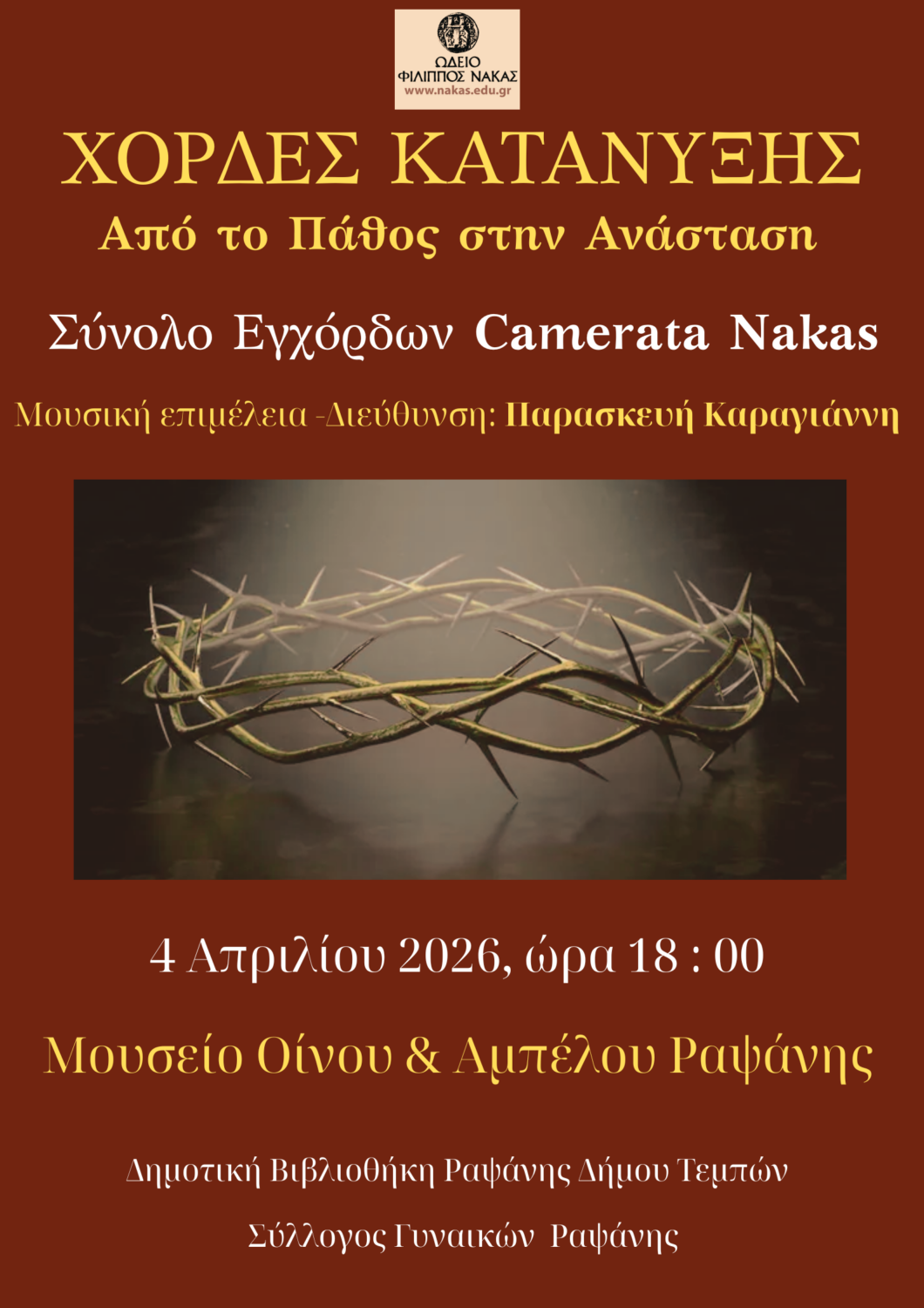 Το Σύνολο Εγχόρδων Camerata Nakas του Ωδείου Φίλιππος Νάκας Θεσσαλονίκης, στο οποίο συμπράττουν καθηγητές και σπουδαστές του Ωδείου, προτείνει μία ακρόαση που υπερβαίνει τα όρια της τυπικής συναυλίας, με τίτλο «Χορδές Κατάνυξης – Από το Πάθος στην Ανάσταση».