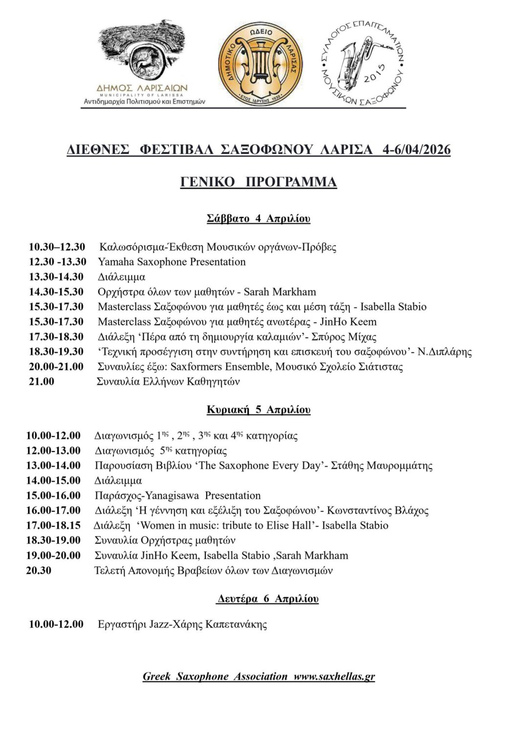 Η φετινή διοργάνωση αναπτύσσεται σε τρεις ημέρες γεμάτες δράσεις, όπου η εκπαιδευτική διάσταση συναντά την καλλιτεχνική πράξη. Στο πρόγραμμα περιλαμβάνονται masterclasses για διαφορετικά επίπεδα σπουδαστών, διαλέξεις με εξειδικευμένο περιεχόμενο, παρουσιάσεις οργάνων και τεχνολογίας, καθώς και συναυλίες που αναδεικνύουν το εύρος και τις εκφραστικές δυνατότητες του σαξοφώνου.