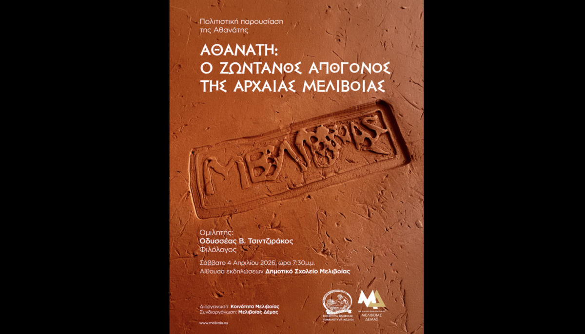 Η εκδήλωση με τίτλο: «Αθανάτη, ο ζωντανός απόγονος της Αρχαίας Μελιβοίας» διοργανώνεται από την Κοινότητα Μελιβοίας και την αστική μη κερδοσκοπική εταιρεία ΜΕΛΙΒΟΙΑΣ ΔΕΜΑΣ.