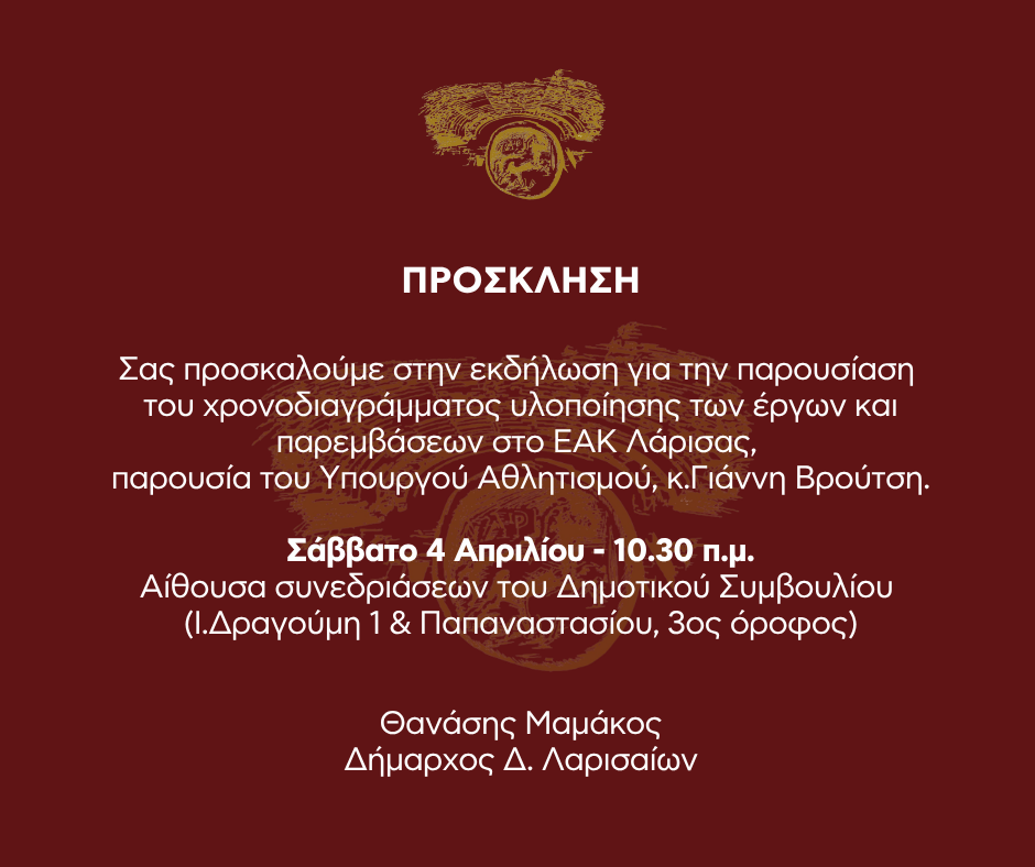 Εκδήλωση για το χρονοδιάγραμμα υλοποίησης των έργων και παρεμβάσεων στο Εθνικό Αθλητικό Κέντρο Λάρισας πραγματοποιεί ο Δήμος Λαρισαίων, σε συνεργασία με το Υπουργείο Παιδείας, Θρησκευμάτων και Αθλητισμού και το ΕΑΚ Λάρισας.