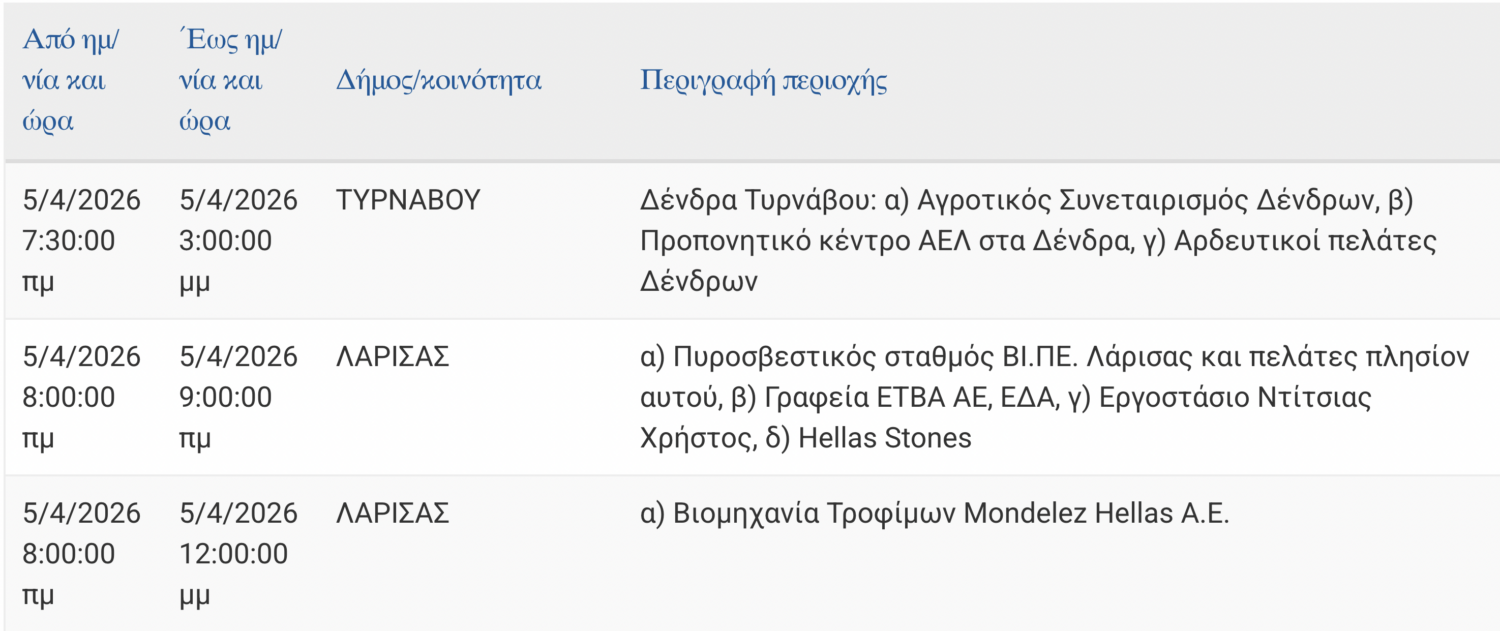 Σε προγραμματισμένες διακοπές στην παροχή ηλεκτρικού ρεύματος σε περιοχές της Λάρισας και του Τυρνάβου θα προχωρήσει την Κυριακή 5 Απριλίου 2026 ο ΔΕΔΔΗΕ Α.Ε.