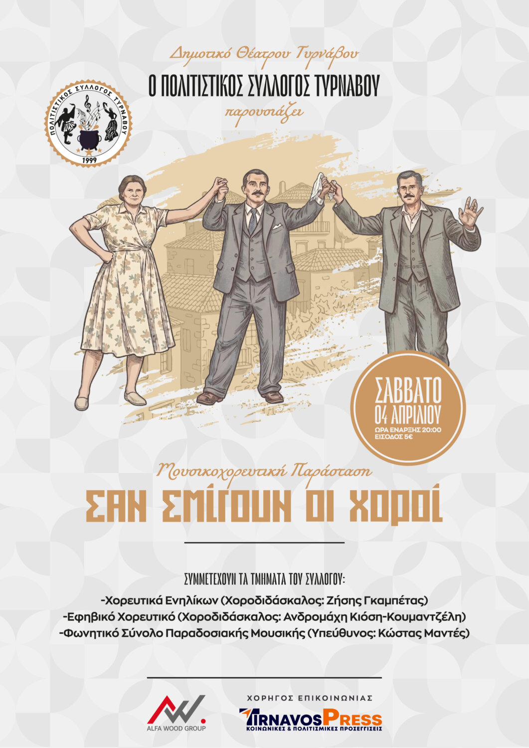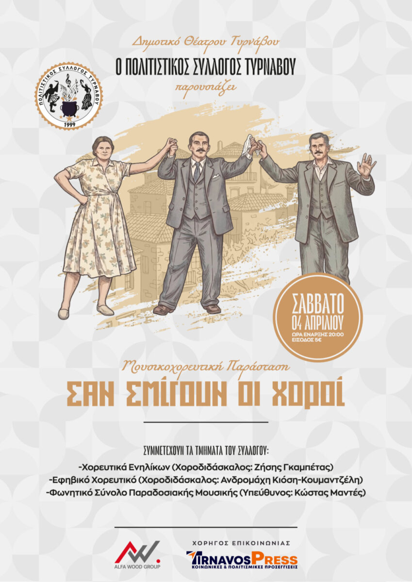 Το Σάββατο, 4 Απριλίου στις 20:00 στο Δημοτικό Θέατρο Τυρνάβου ο Πολιτιστικός Σύλλογος Τυρνάβου σας προσκαλεί σε ένα ταξίδι στην Ελληνική παράδοση. Ξεκινώντας με τις Λαζαρίνες, ένα όμορφο και ιδιαίτερο έθιμο της άνοιξης, θα ταξιδέψουμε μέσα από τον χορό και το τραγούδι από τα ορεινά της Δυτικής Μακεδονίας στον απέραντο Θεσσαλικό κάμπο αλλά και την καρδιά της Ηπείρου, εκεί όπου το γλέντι γίνεται ζωή.