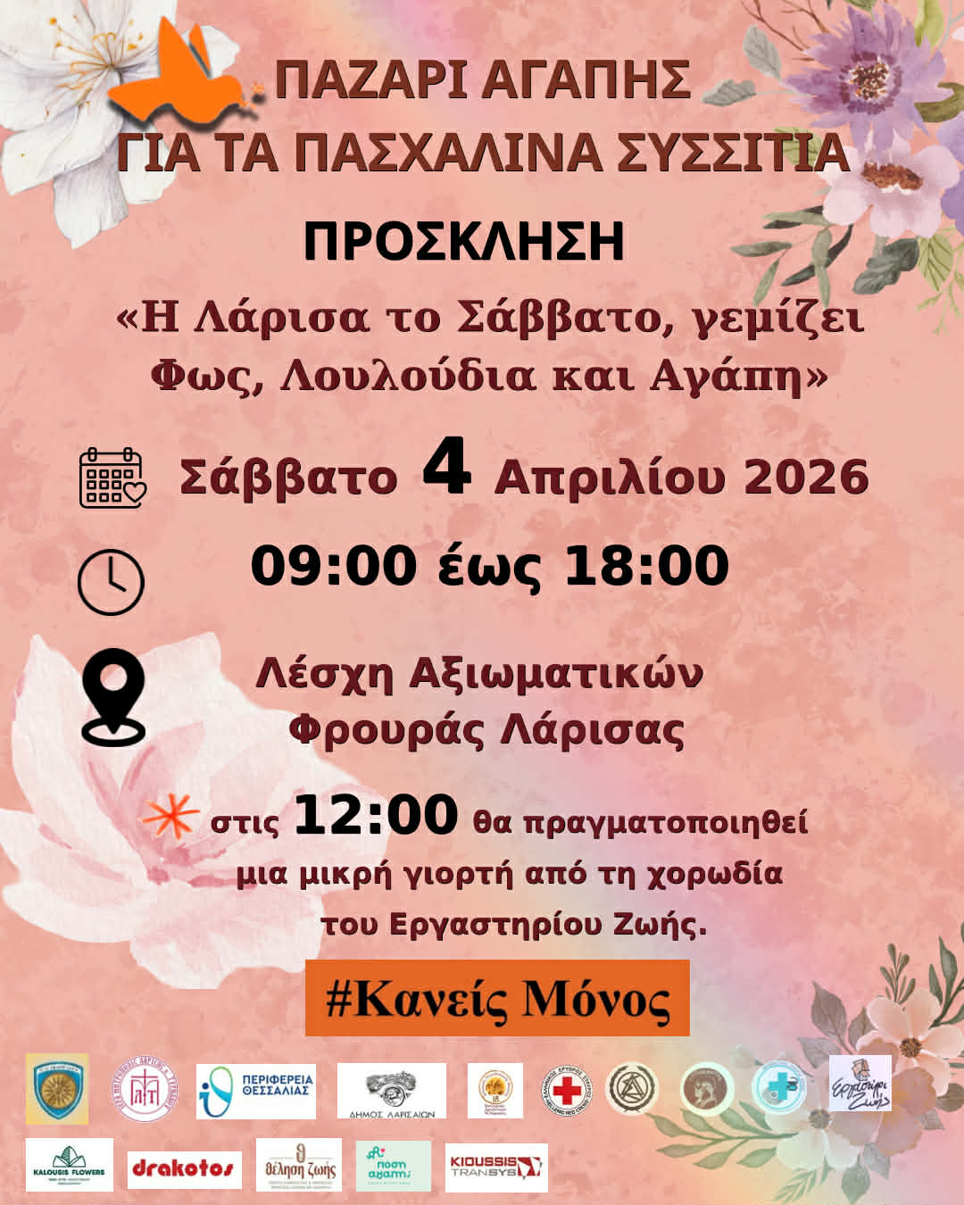 Το Κοινωνικό Εθελοντικό Δίκτυο #Κανείς_Μόνος και η Βουλευτής Λάρισας Ευαγγελία Λιακούλη, με συνδιοργανωτές την Λέσχη Αξιωματικών Λάρισας, την Ιερά Μητρόπολη Λαρίσης και Τυρνάβου, την Περιφέρεια Θεσσαλίας, το Δήμο Λαρισαίων, τη Συντεχνία Αρτοποιών, το Περιφερειακό Τμήμα Λάρισας του Ελληνικού Ερυθρού Σταυρού, το Δικηγορικό Σύλλογο Λάρισας, τον Ιατρικό Σύλλογο Λάρισας και το Φαρμακευτικό Σύλλογο Λάρισας, πραγματοποιούν αύριο Σάββατο 4 Απριλίου 2026, στη Λέσχη Αξιωματικών Φρουράς Λάρισας, το «Παζάρι Αγάπης», από ώρες 09:00 έως 18:00, μια εθελοντική δράση-θεσμό πλέον της πόλης, τα έσοδα της οποίας θα διατεθούν φέτος στα συσσίτια της Ιεράς Μητρόπολης Λαρίσης & Τυρνάβου, έτσι ώστε κανείς αναγκεμένος Άνθρωπος να μην μείνει μόνος, αβοήθητος και στο περιθώριο, τις άγιες μέρες του Πάσχα.