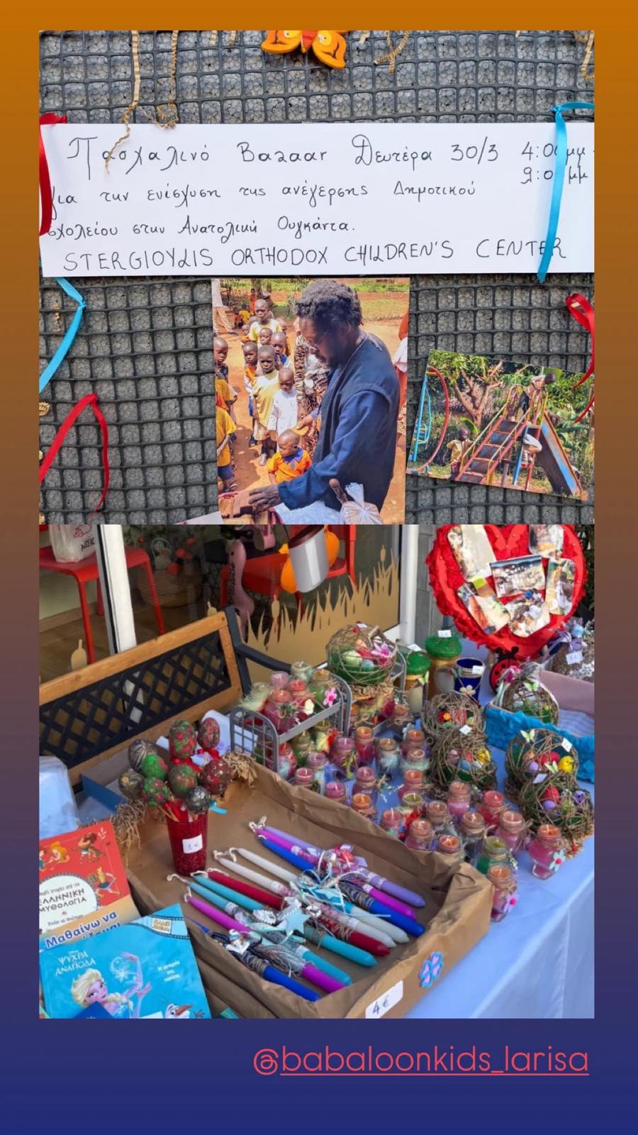 Ο Ιεραποστολικός Σύλλογος «ΠΟΡΕΙΑ ΑΓΑΠΗΣ», που εδρεύει στη Λάρισα, εκφράζει τις θερμές του ευχαριστίες στη διεύθυνση, τους εκπαιδευτικούς και κυρίως στους μαθητές του ΚΔΑΠ «BABALOON» Λάρισας, για την πρωτοβουλία τους να λειτουργήσουν δωροέκθεση, τις ημέρες του Πάσχα, ώστε να ενισχύσουν το σχολείο των Λαρισαίων γνωστό και ως «STERGIOULIS ORTHODOX CHILDREN’S CENTER» στην Ανατολική Ουγκάντα (Ιερά Επισκοπή Jinja κσι Ανατ.Uganda).