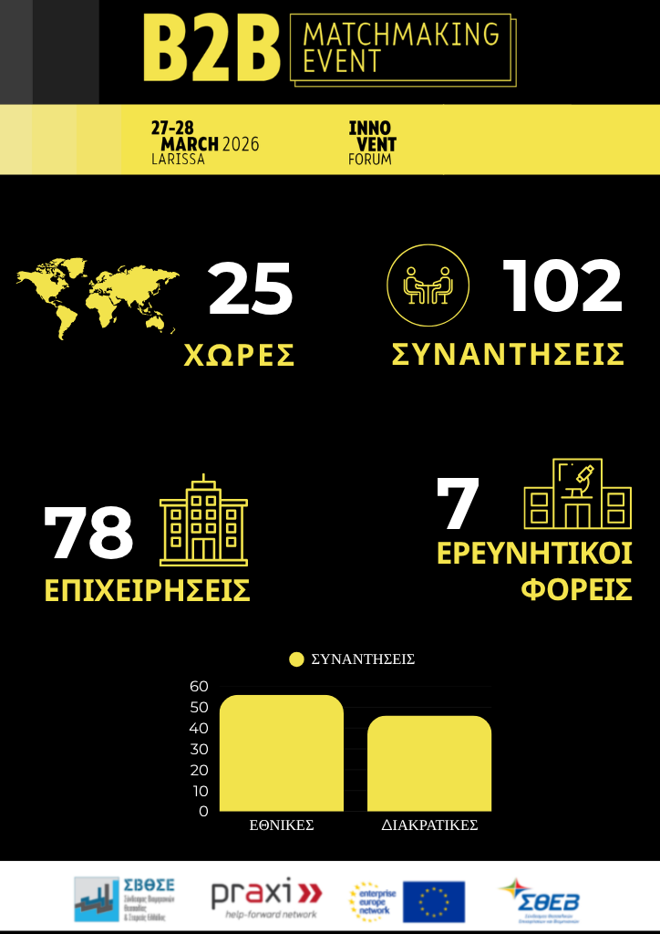 Με μεγάλη επιτυχία ολοκληρώθηκε το Matchmaking Event του Innovent Forum 2026, φέρνοντας στο προσκήνιο νέες ευκαιρίες συνεργασίας. Οι επιχειρηματικές συναντήσεις διοργανώθηκαν από το Δίκτυο ΠΡΑΞΗ και τον Σύνδεσμο Βιομηχανιών Θεσσαλίας & Στερεάς Ελλάδος – ΣΒΘΣΕ, μέλη του Enterprise Europe Network, σε συνεργασία με τον Σύνδεσμο Θεσσαλικών Επιχειρήσεων και Βιομηχανιών – ΣΘΕΒ και το JOIST Innovation Park.