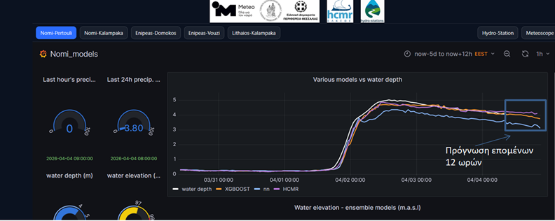 - ενώ παράλληλα ενσωματώνει δυναμικά τις πραγματικές μετρήσεις στάθμης από τους υδρολογικούς σταθμούς, βελτιώνοντας συνεχώς την ακρίβεια της πρόγνωσης.