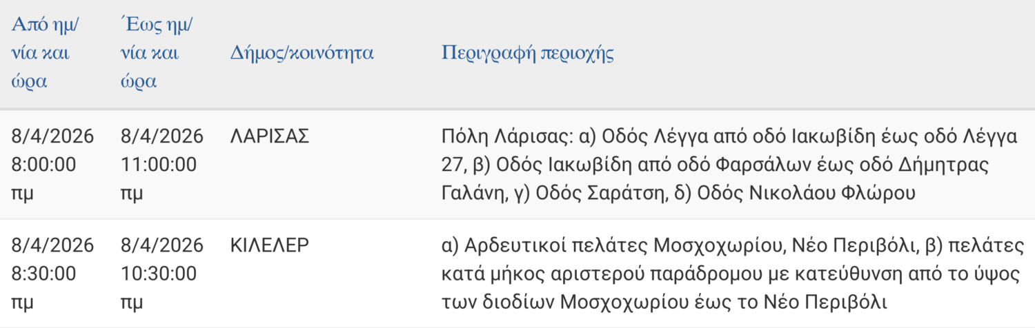 Σε προγραμματισμένες διακοπές στην παροχή ηλεκτρικού ρεύματος σε δρόμους της Λάρισας και περιοχές της Περιφερειακής Ενότητας θα προχωρήσει σήμερα Τετάρτη 8 Απριλίου 2026 ο ΔΕΔΔΗΕ Α.Ε.