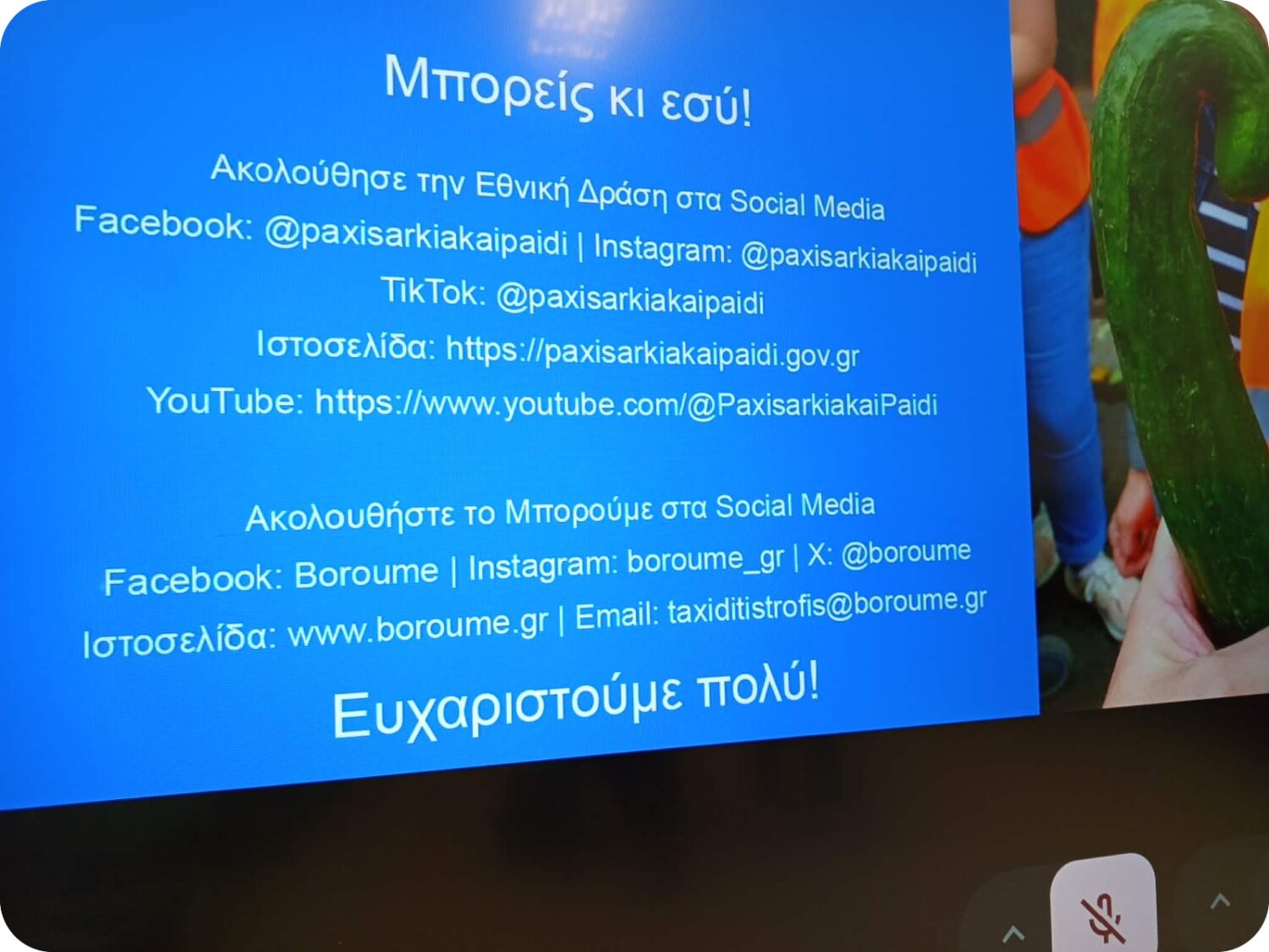 «Στο πλαίσιο υλοποίησης του Έργου «Το ταξίδι της τροφής», με σκοπό την πραγματοποίηση των στόχων της Εθνικής Δράσης για την καταπολέμηση της Παιδικής Παχυσαρκίας, σε συνεργασία της UNICEF και του ΜΠΟΡΟΥΜΕ, μέσω της προγραμματικής συμφωνίας GRE/PCA202468/PD2024147, με χρηματοδότηση από το Υπουργείο Υγείας μέσω του Ταμείου Ανάκαμψης και Ανθεκτικότητας το Σχολείο μας συμμετείχε σε εκπαιδευτική και ενημερωτική δράση του προγράμματος.