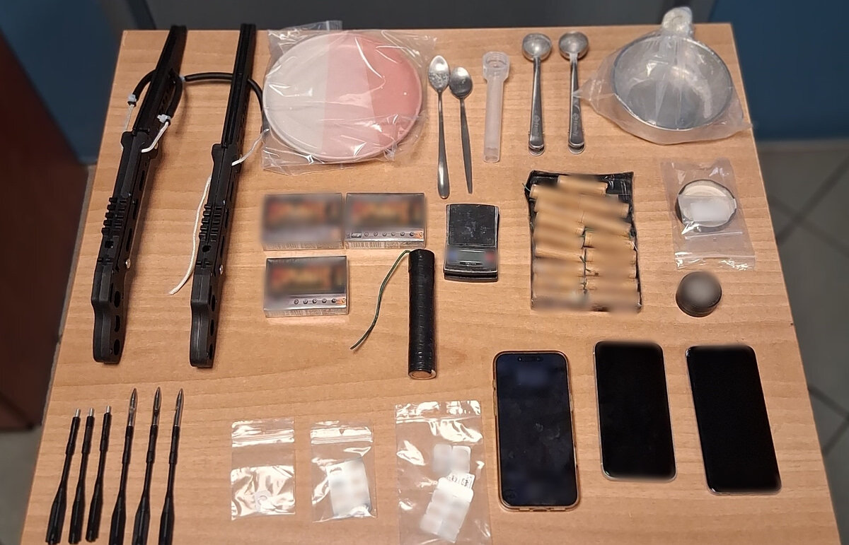 Σε νομότυπες έρευνες που πραγματοποιήθηκαν σε οικίες, αποθηκευτικούς χώρους και στην κατοχή των συλληφθέντων, βρέθηκε και κατασχέθηκε πλήθος αντικειμένων. Μεταξύ αυτών περιλαμβάνονται ναρκωτικά δισκία χωρίς ιατρική συνταγή, ηλεκτρονική ζυγαριά ακριβείας, τρίφτης κάνναβης και εξαρτήματα καπνισμού, καθώς και μικροποσότητα λευκής ουσίας.