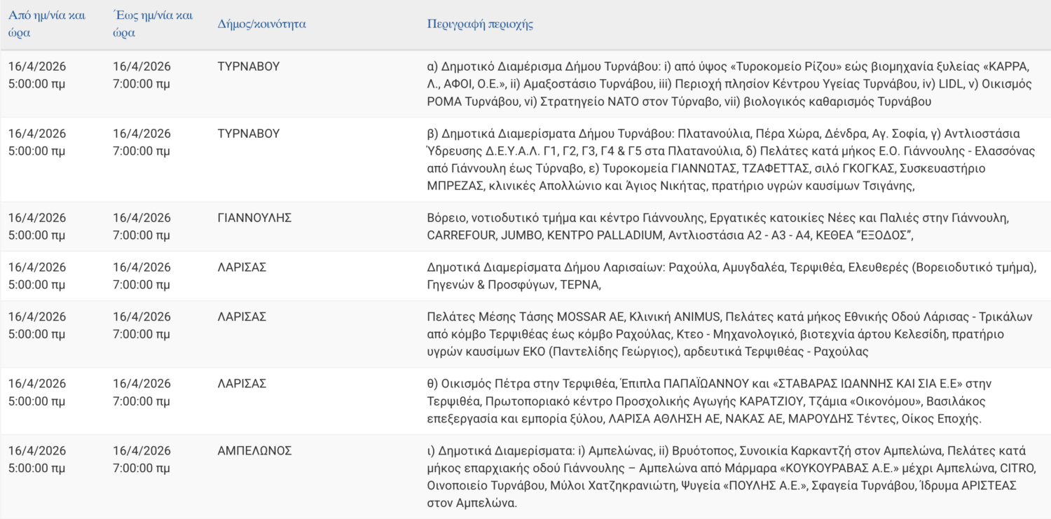 Σε προγραμματισμένες διακοπές στην παροχή ηλεκτρικού ρεύματος σε περιοχές της Λάρισας και της Περιφερειακής Ενότητας θα προχωρήσει την Πέμπτη 16 Απριλίου 2026 ο ΔΕΔΔΗΕ Α.Ε.