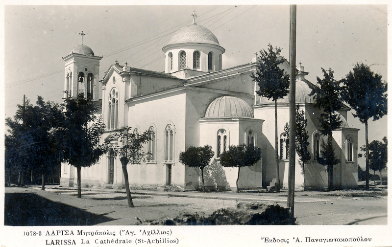 Λόγω της Μ. Εβδομάδας, η εικόνα είναι θρησκευτική. Επιστολικό δελτάριο (καρτ ποστάλ) το οποίο απεικονίζει τον προπολεμικό μητροπολιτικό ναό του Αγ. Αχιλλίου.