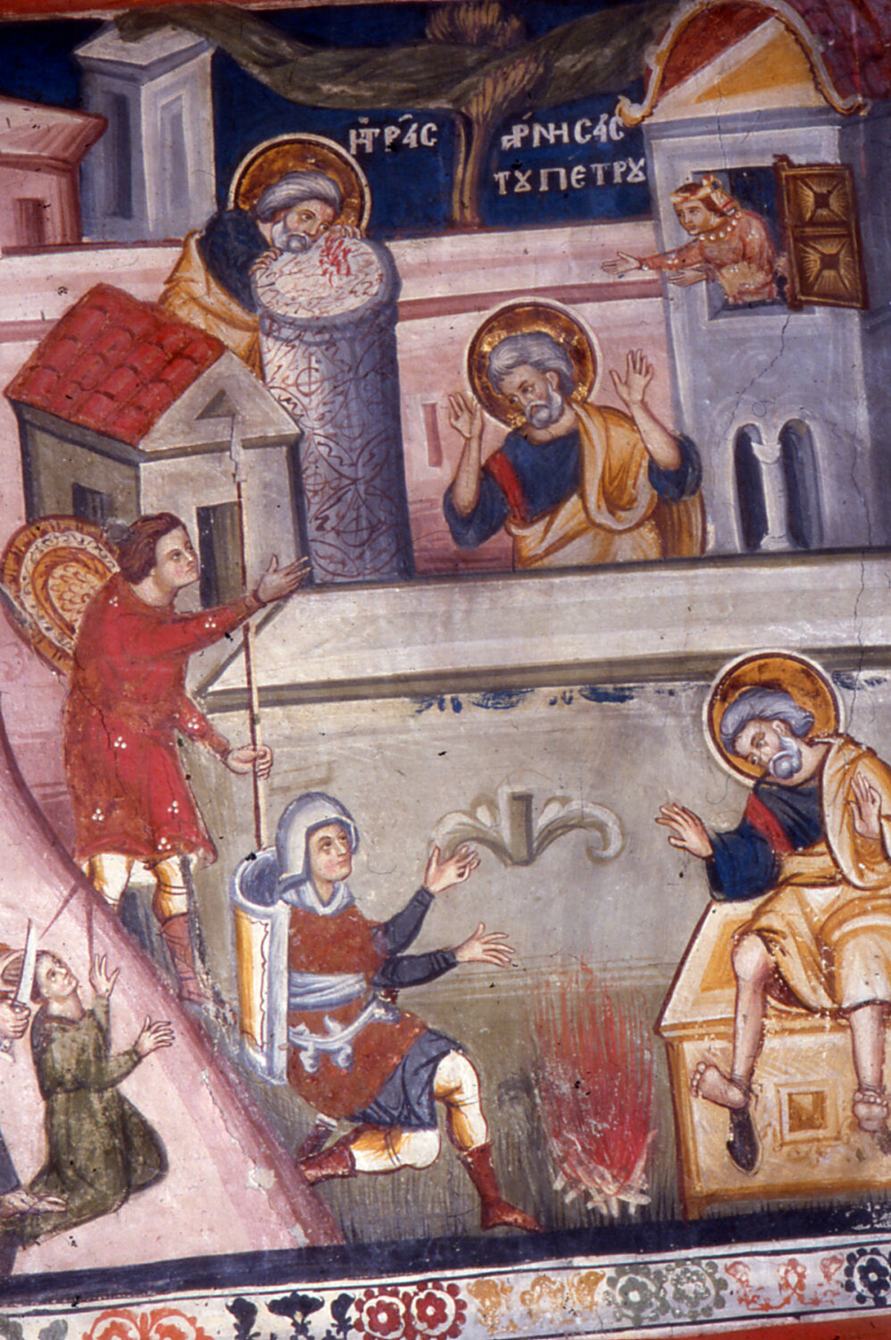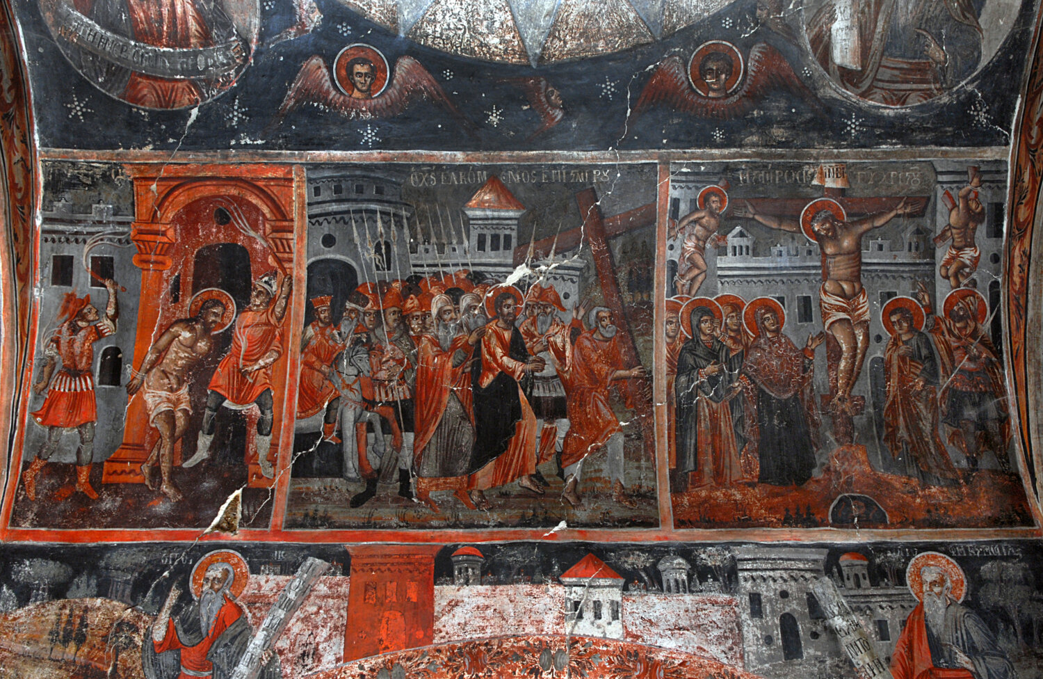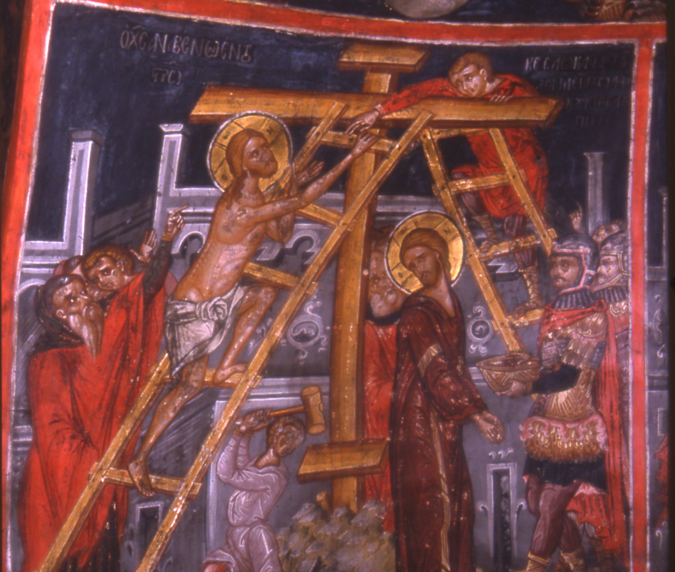 Στην Ανάβαση του Χριστού στο Σταυρό, από τη Μονή Βαρλαάμ στα Μετέωρα, παρακολουθούμε το Χριστό να ανεβαίνει τη σκάλα με ζήλο, αποτυπώνοντας το στίχο «Ερχόμενος ο Κύριος προς το εκούσιον Πάθος», που διαβάζεται τη Μεγάλη Δευτέρα, χαρακτηριστική πτυχή του χριστιανικού δόγματος. Πίσω από το Χριστό οι Ιουδαίοι χειρονομούν ζωηρά και η επικεφαλής μορφή εκτοξεύει κατάρες. Παραδίπλα, ζωγραφίζεται η σκηνή με το Χριστό που αποστρέφεται το «όξος».