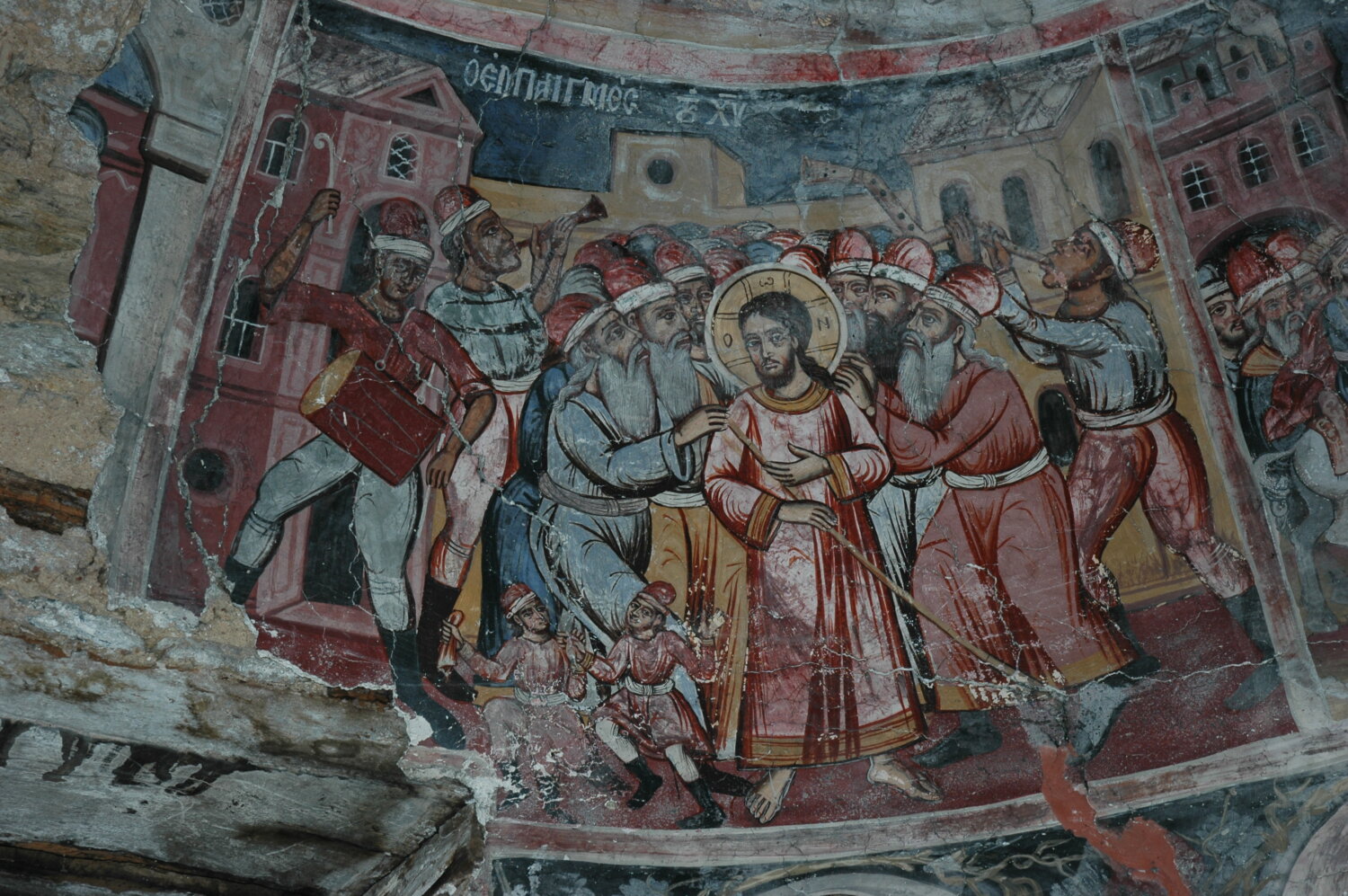 Ιδιαίτερα πλούσια είναι η σκηνή του Εμπαιγμού, που παρουσιάζει μεγάλη ποικιλία από χορευτές, μίμους και μουσικά όργανα. Εδώ στη σκηνή από τη Ραψάνη, ο ζωγράφος επιχειρεί να εντάξει στην παράσταση στοιχεία από την εποχή του, όπως φαίνεται στις ενδυμασίες των μορφών και μας εκπλήσσει βάζοντας τα παιδιά που χορεύουν παραδοσιακό χορό, στο πρώτο επίπεδο.