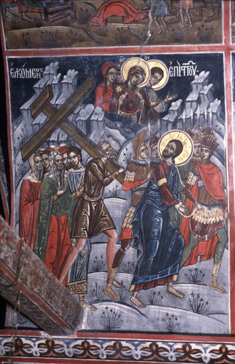 Στον Ελκόμενο Χριστό της Μονής Πέτρας (1625), ο Χριστός στρέφεται προς τα πίσω κατά την πορεία του στο Γολγοθά για να αντικρύσει τη μητέρα του, που παρακολουθεί από μακριά, σε μια στιγμή γεμάτη συγκίνηση.