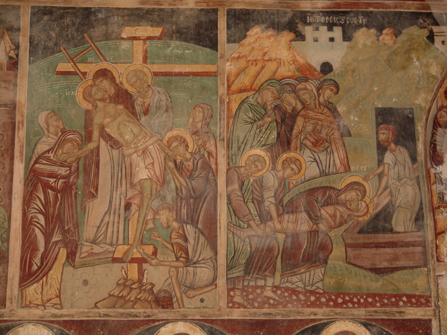 Η παρουσία των Μυροφόρων, ιδιαίτερα πολυάριθμη στην παλαιολόγεια ζωγραφική, εδώ περιορίζεται σε τρείς μορφές, που θρηνούν με ιδιαίτερα εκφραστικές κινήσεις, ιδίως εκείνη στο βάθος, που αποδίδει τη Μαρία Μαγδαληνή.