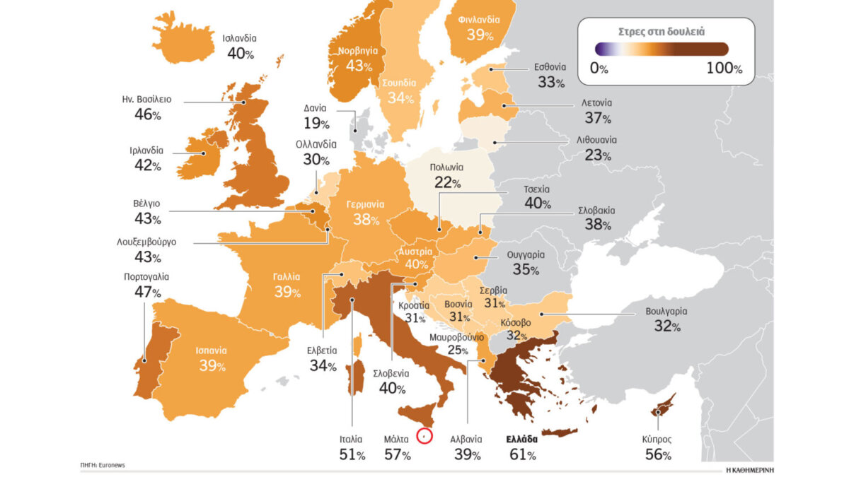 Σε ό,τι αφορά το στρες, οι Νοτιοευρωπαίοι επηρεάζονται πιο έντονα, με 61% των Ελλήνων να δηλώνουν ότι υποφέρουν από άγχος, 57% των Μαλτέζων, 56% των Κυπρίων, 51% των Ιταλών και 39% των Ισπανών.