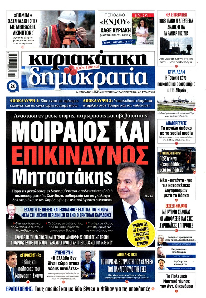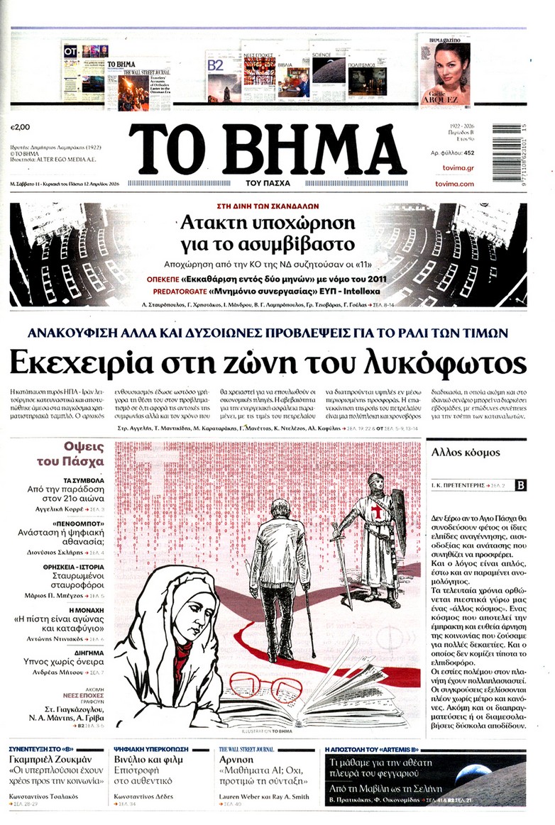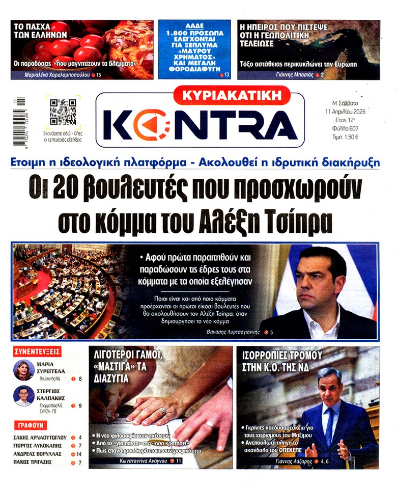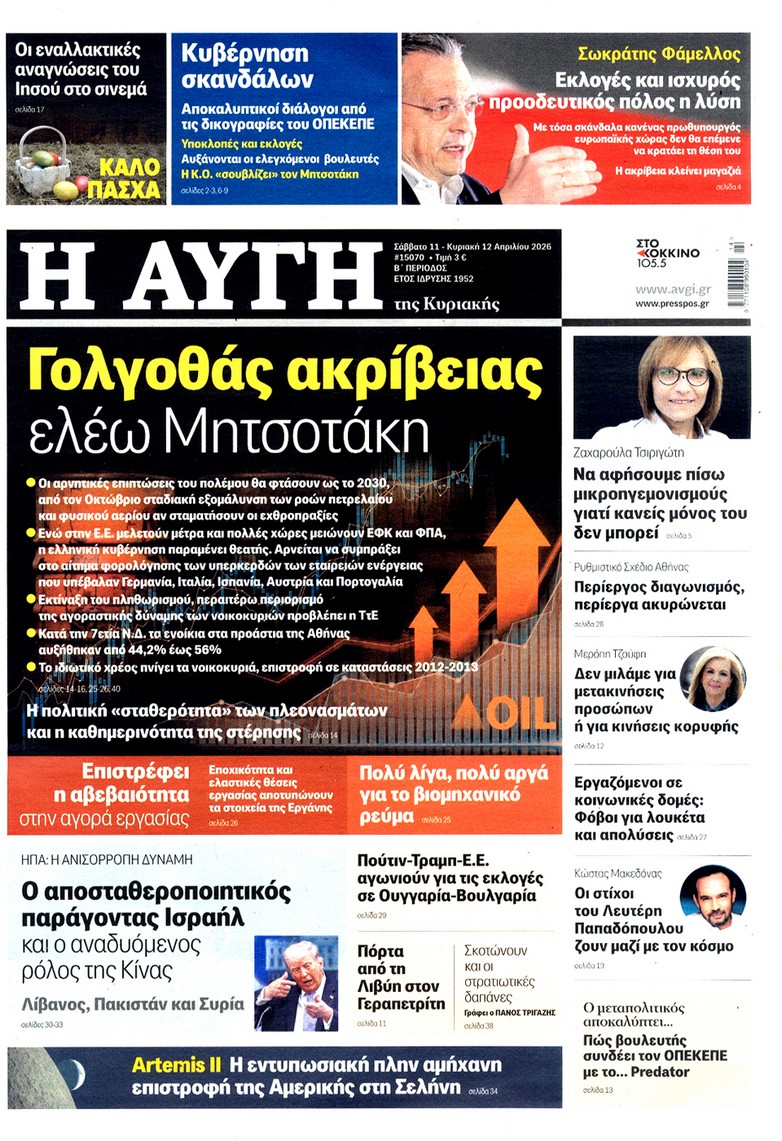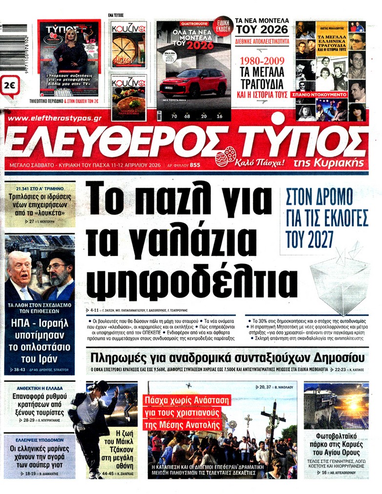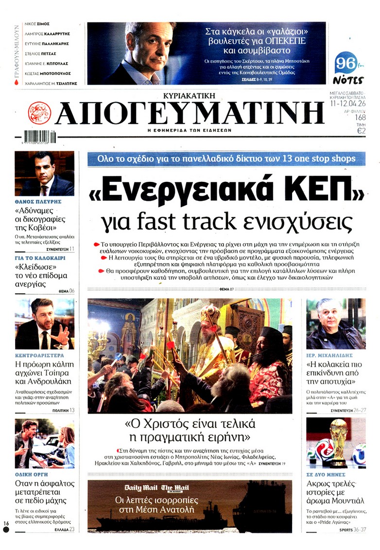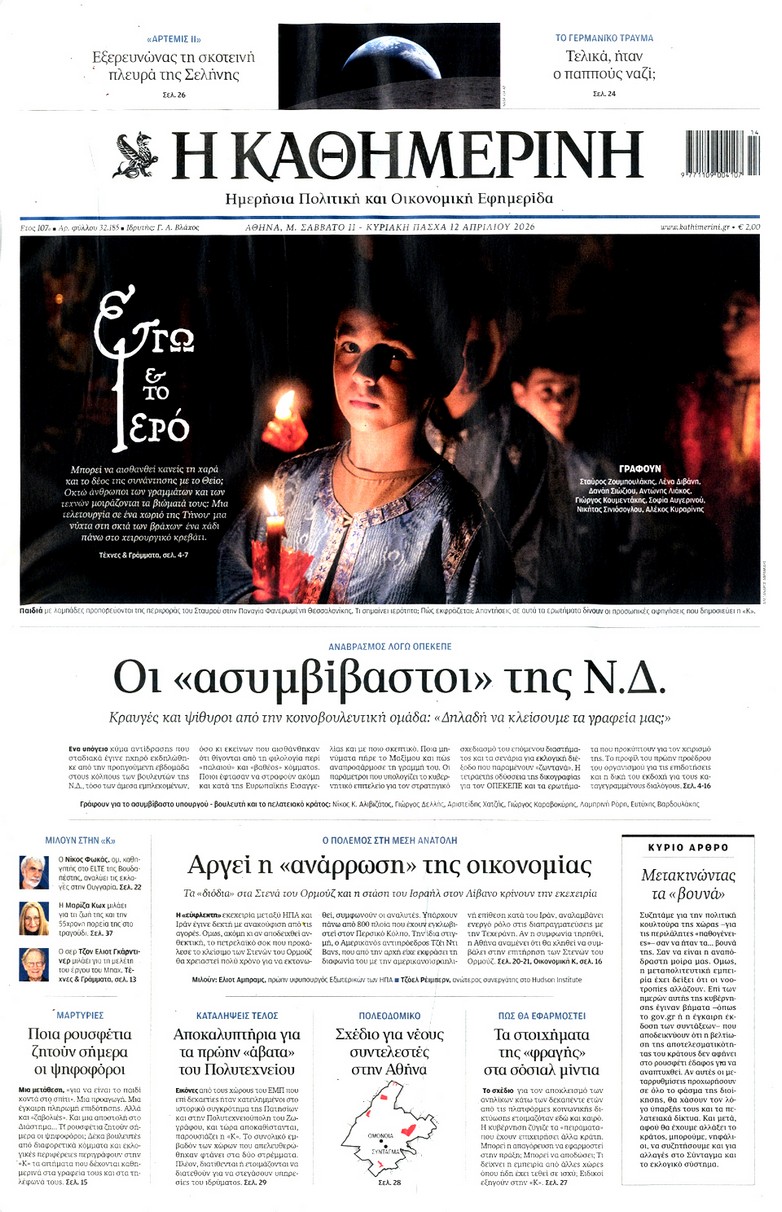 Οι «ασυμβίβαστοι» της Νέας Δημοκρατίας, το παζλ για τα γαλάζια ψηφοδέλτια, η προετοιμασία για κάλπες από το φθινόπωρο και μετά, η μετακόμιση των βάσεων των ΗΠΑ στην Ελλάδα, αλλά και η εκεχειρία στον πόλεμο ΗΠΑ με Ιράν κυριαρχούν στα πρωτοσέλιδα των κυριακάτικων εφημερίδων που λόγω Πάσχα κυκλοφορούν Μεγάλο Σάββατο.