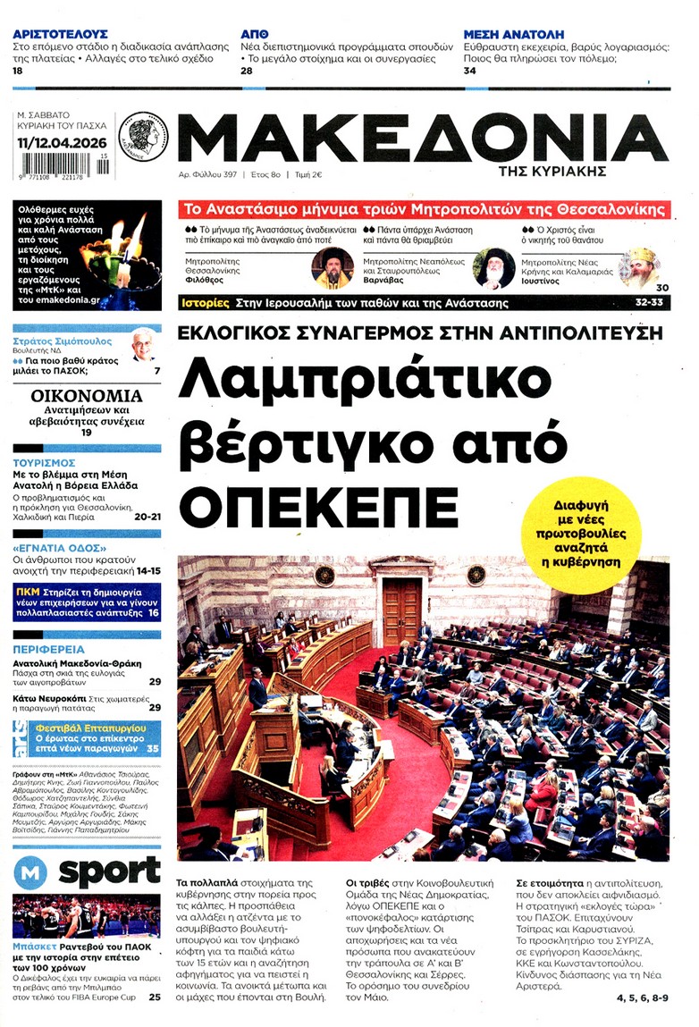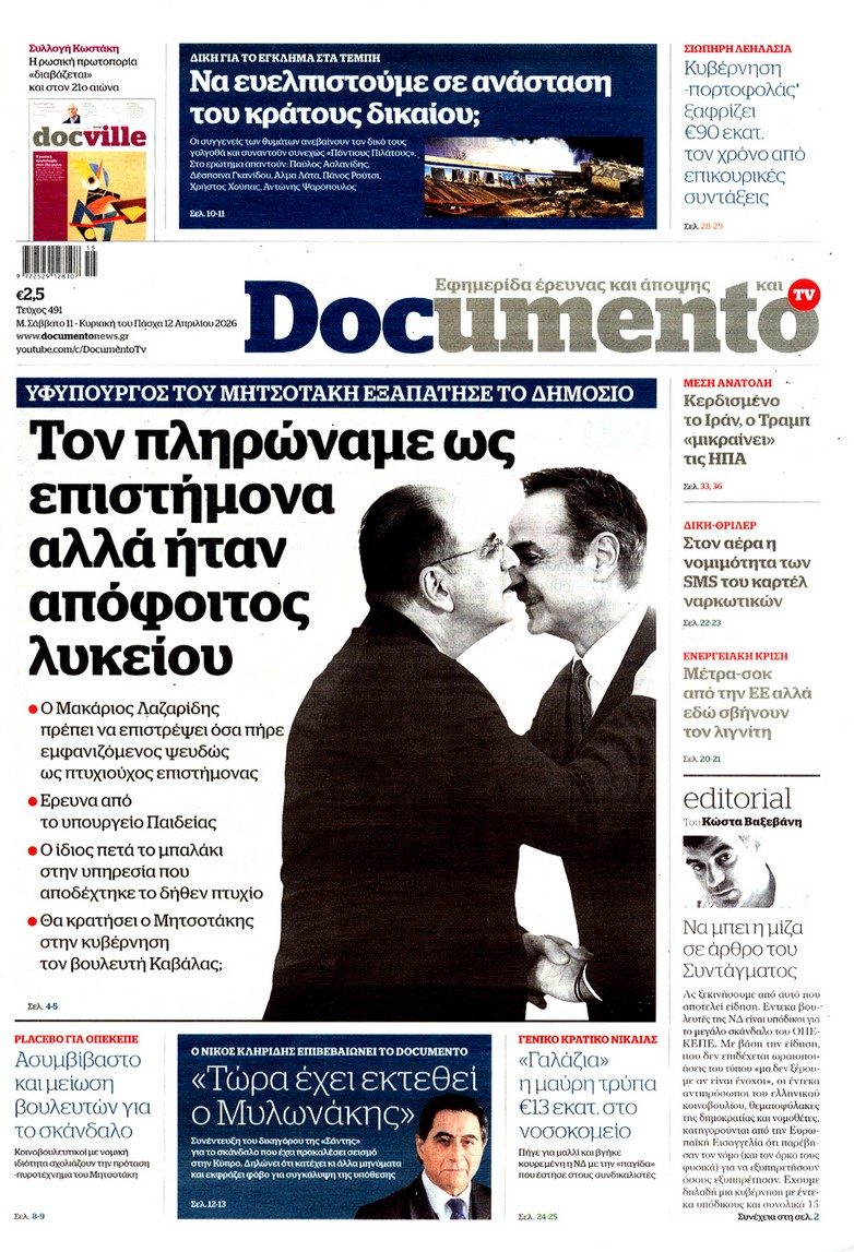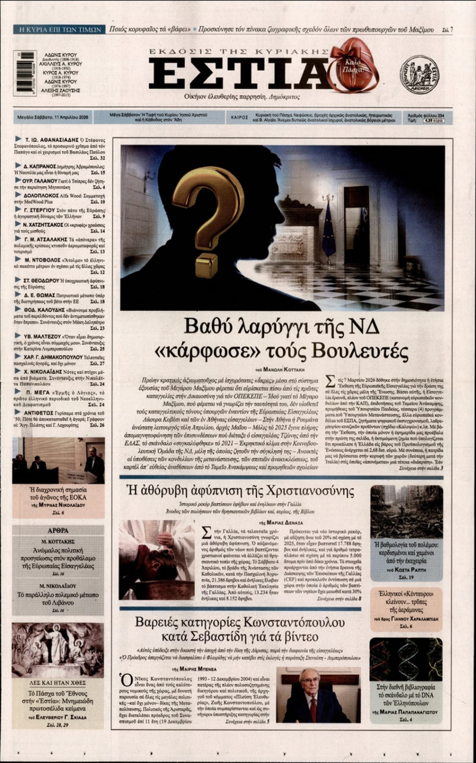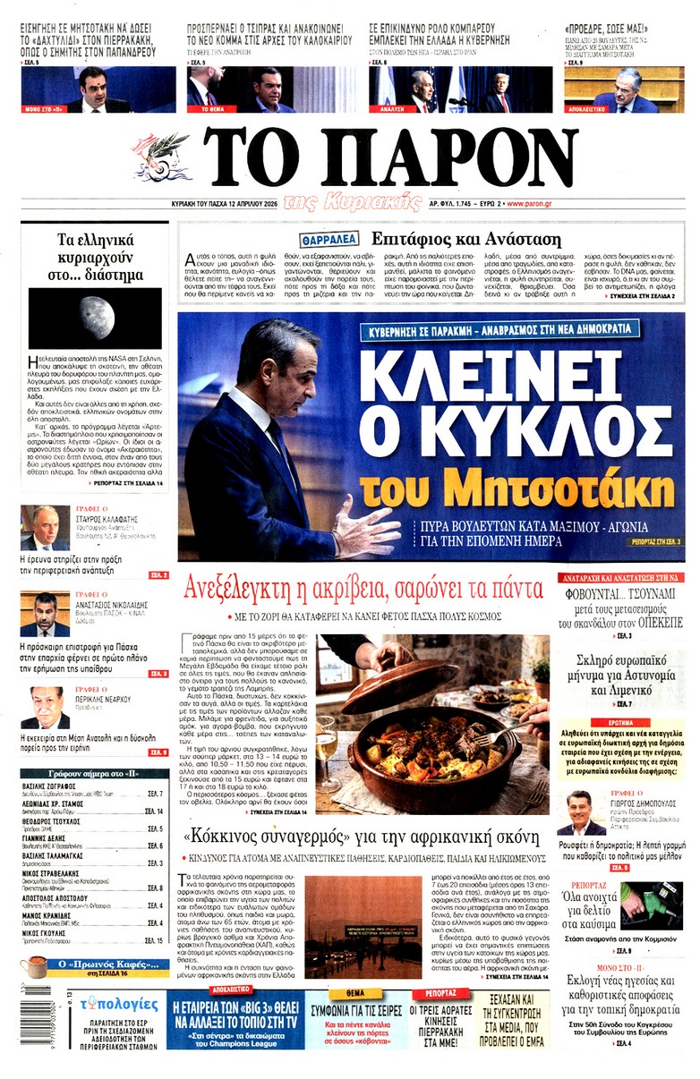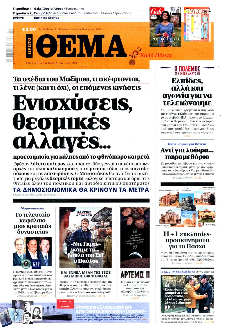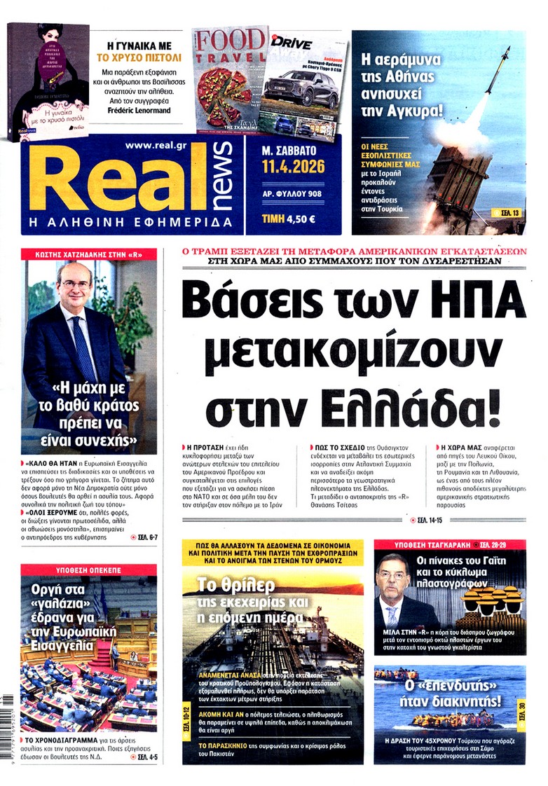 Οι «ασυμβίβαστοι» της Νέας Δημοκρατίας, το παζλ για τα γαλάζια ψηφοδέλτια, η προετοιμασία για κάλπες από το φθινόπωρο και μετά, η μετακόμιση των βάσεων των ΗΠΑ στην Ελλάδα, αλλά και η εκεχειρία στον πόλεμο ΗΠΑ με Ιράν κυριαρχούν στα πρωτοσέλιδα των κυριακάτικων εφημερίδων που λόγω Πάσχα κυκλοφορούν Μεγάλο Σάββατο.