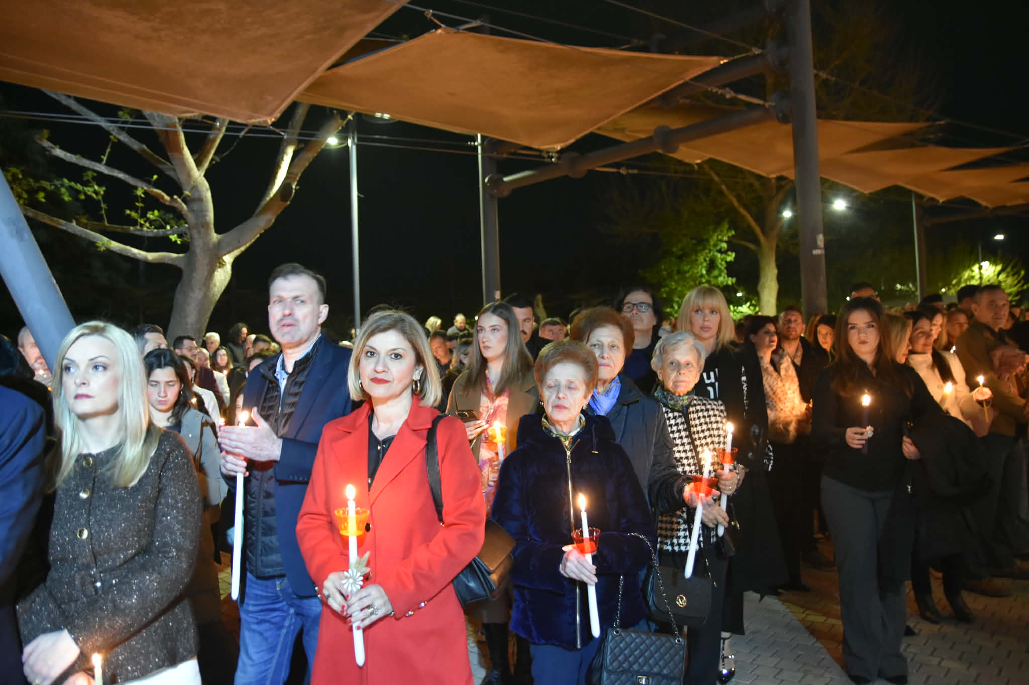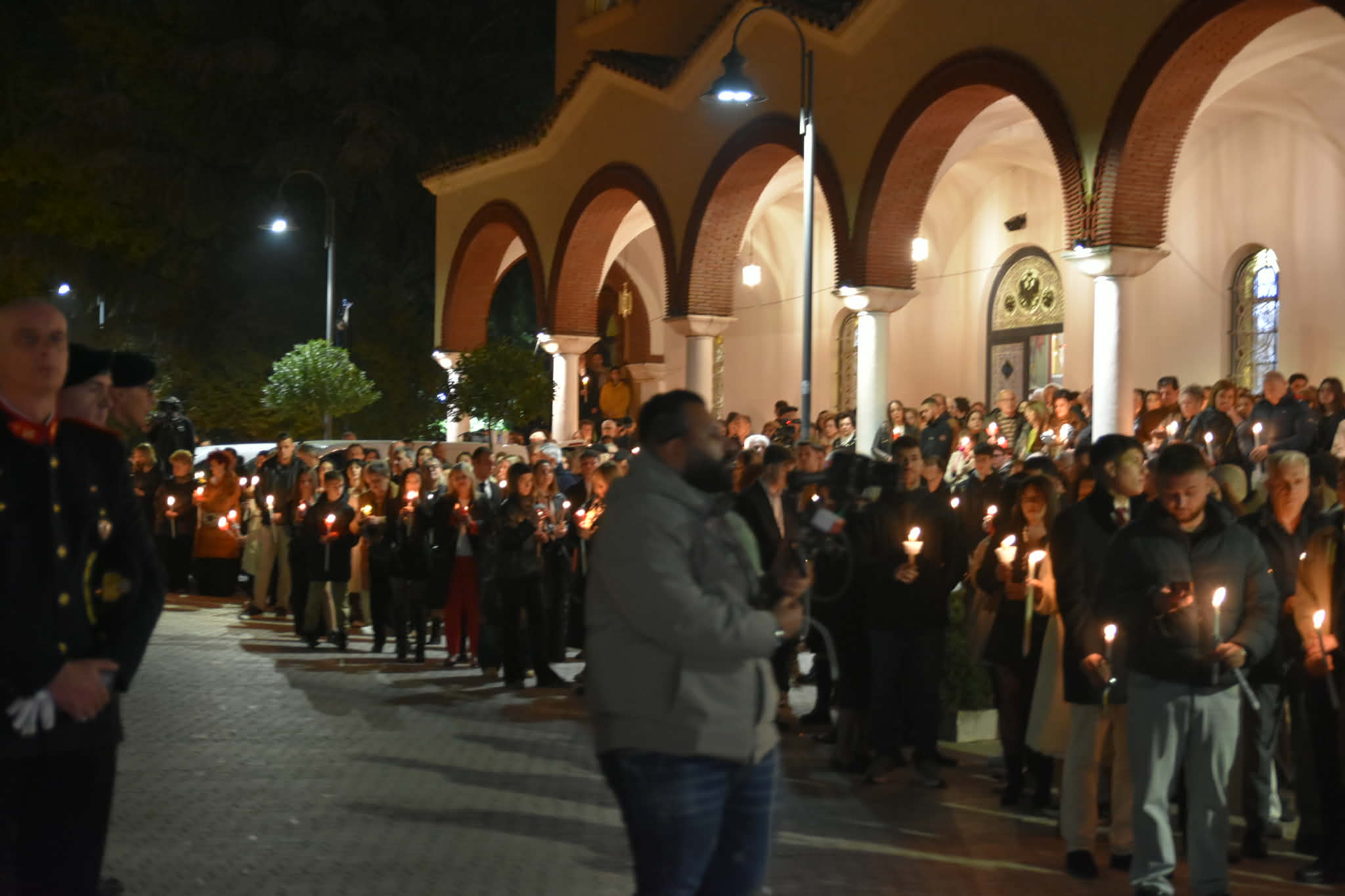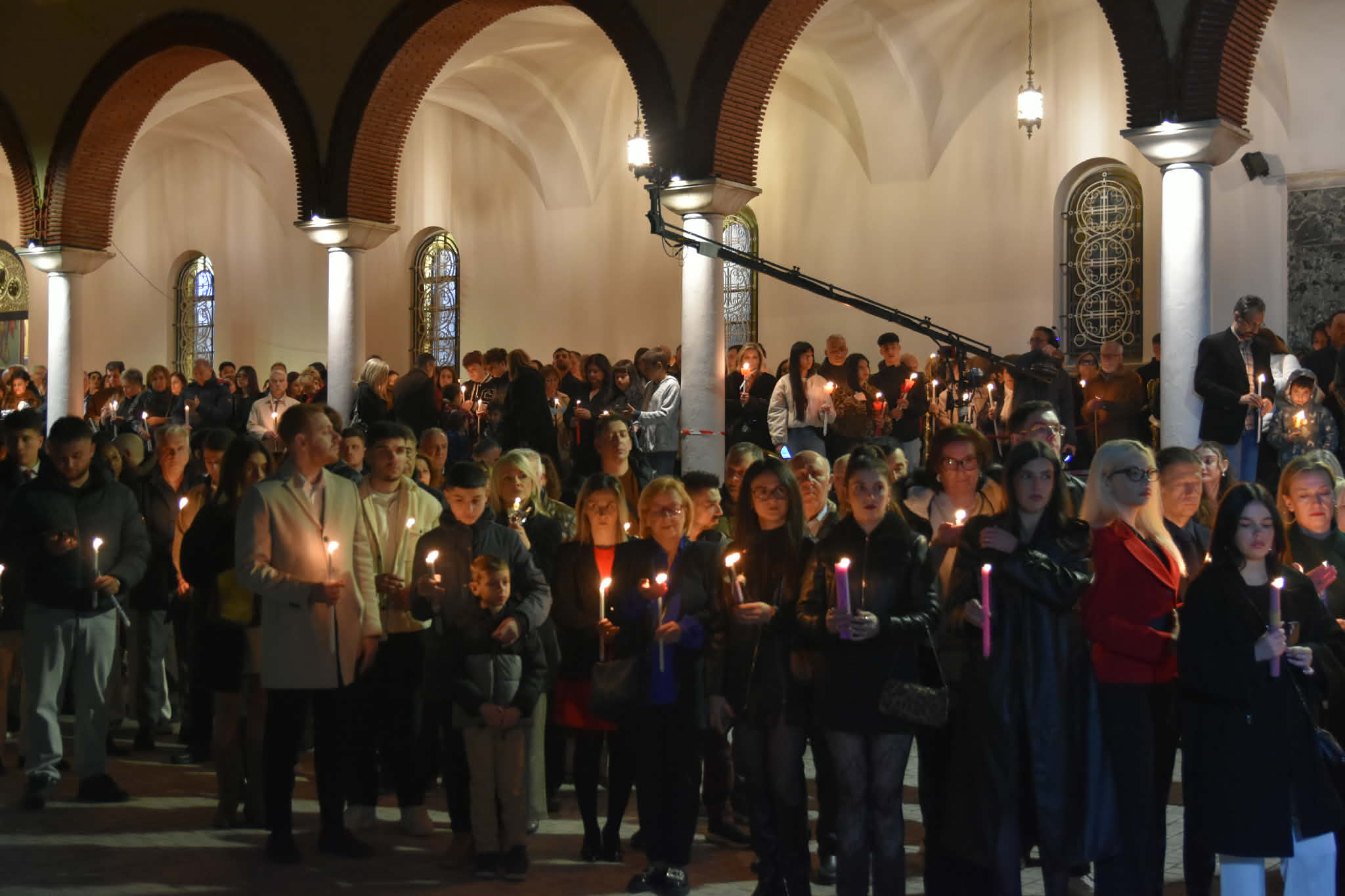 Πλήθος πιστών κατέκλυσε τον ναό, κρατώντας τις λαμπάδες τους αναμμένες, μεταφέροντας το Άγιο Φως και ανταλλάσσοντας ευχές ελπίδας και αγάπης.