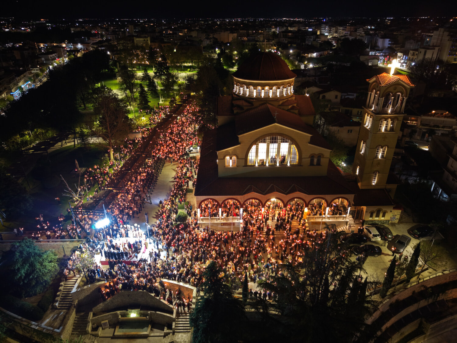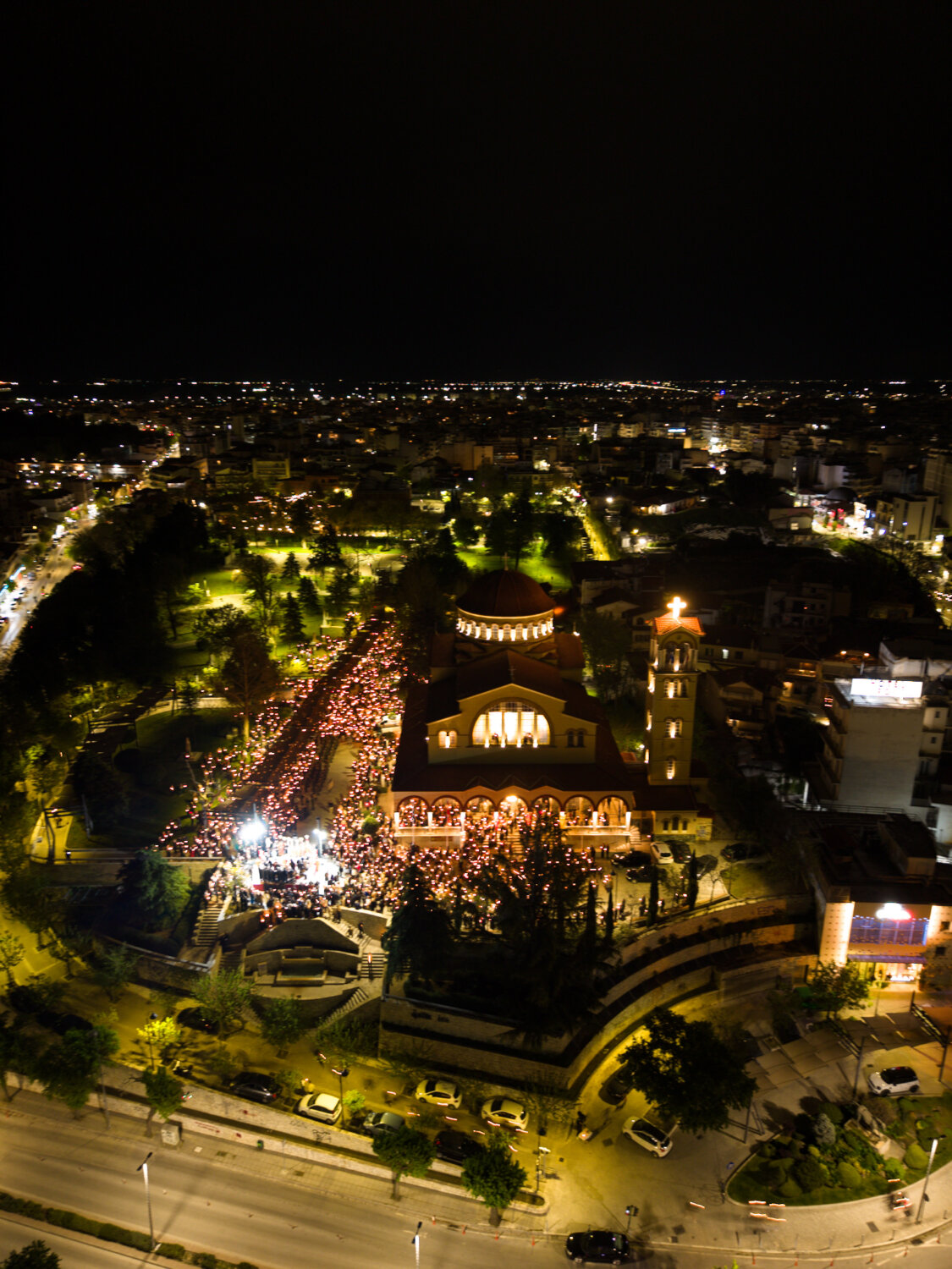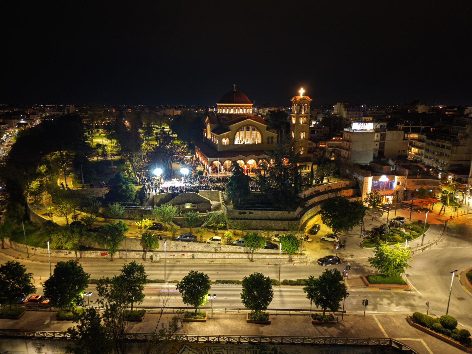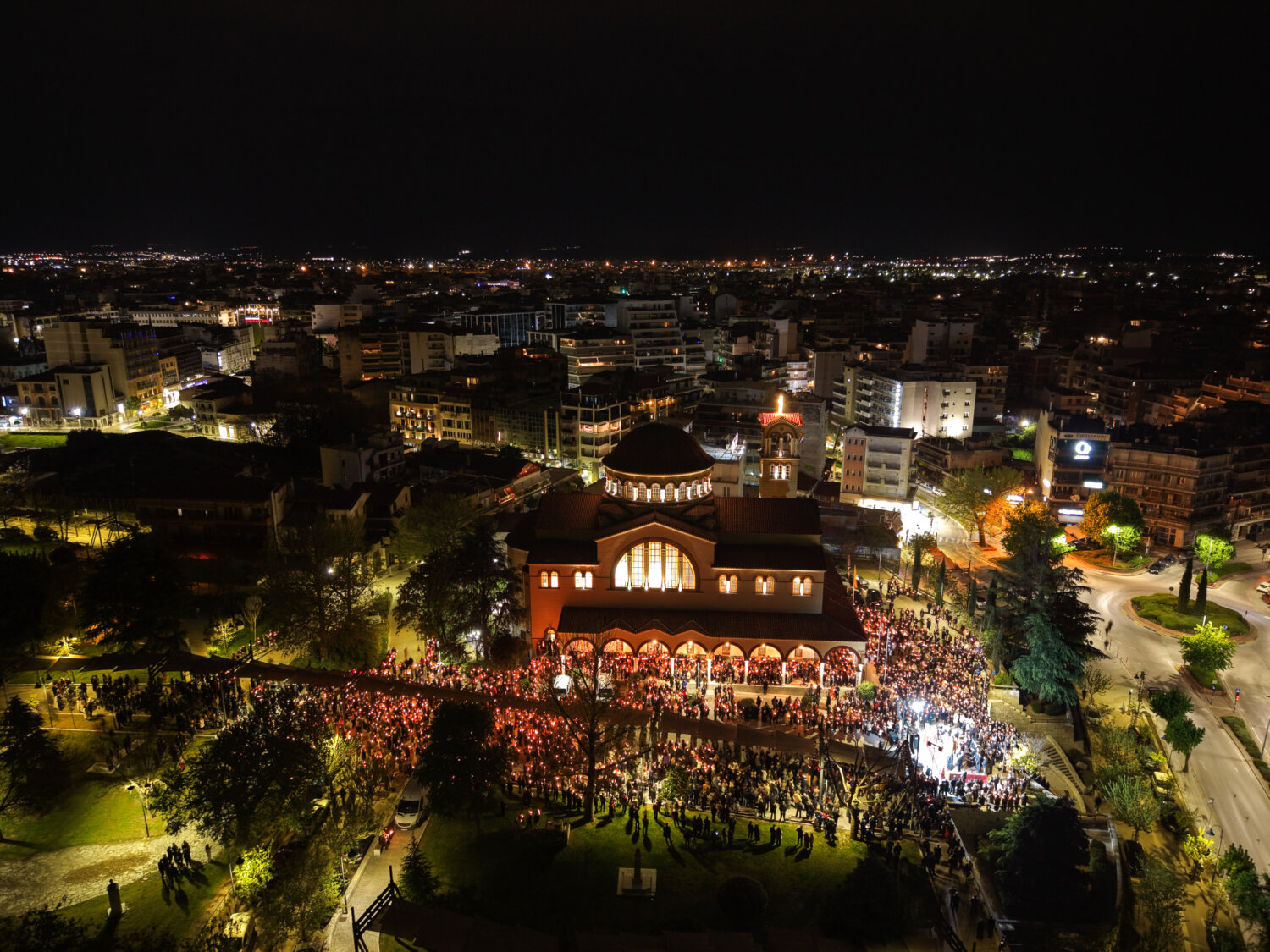 Από ψηλά, η στιγμή της Ανάστασης στον Ιερό Ναό Αγίου Αχιλλίου αποκαλύπτεται με μια διαφορετική ματιά. Φως, κατάνυξη και πλήθος κόσμου ενώνονται σε ένα μοναδικό νυχτερινό σκηνικό στην καρδιά της Λάρισας. Δείτε τις εντυπωσιακές εικόνες μέσα από drone: