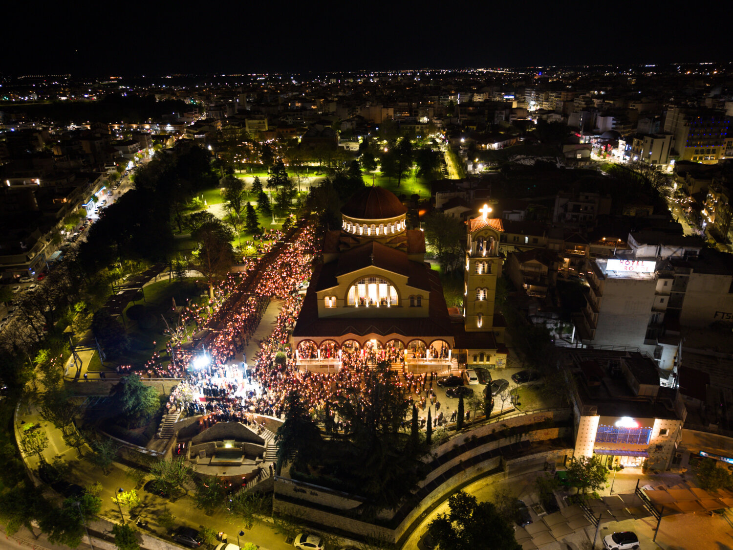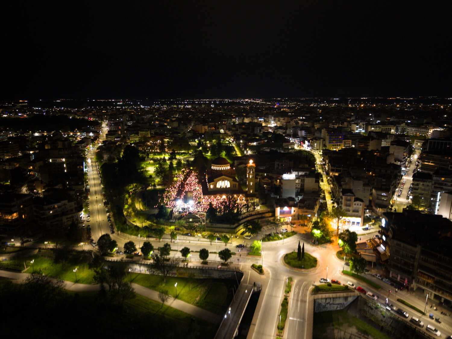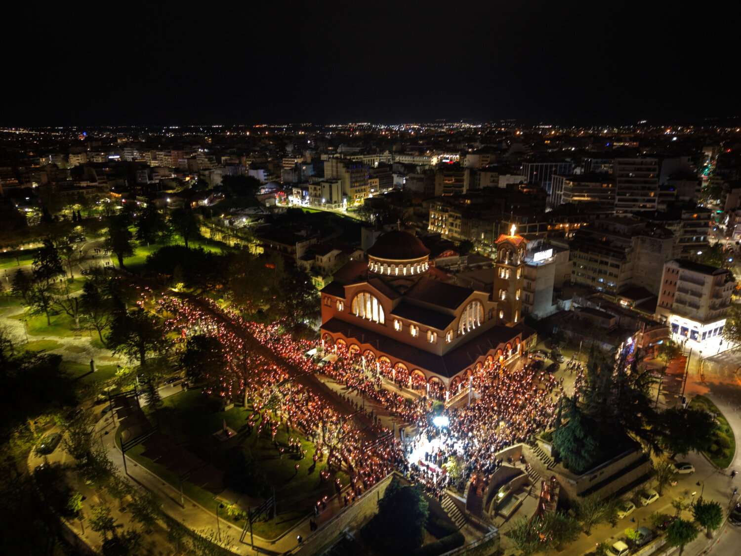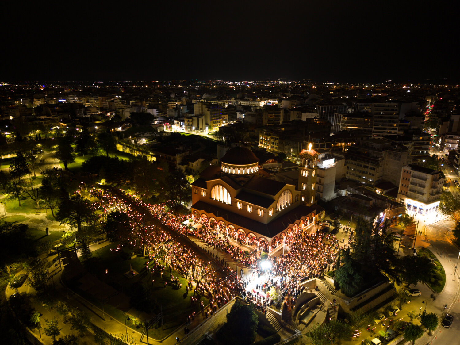 Από ψηλά, η στιγμή της Ανάστασης στον Ιερό Ναό Αγίου Αχιλλίου αποκαλύπτεται με μια διαφορετική ματιά. Φως, κατάνυξη και πλήθος κόσμου ενώνονται σε ένα μοναδικό νυχτερινό σκηνικό στην καρδιά της Λάρισας. Δείτε τις εντυπωσιακές εικόνες μέσα από drone: