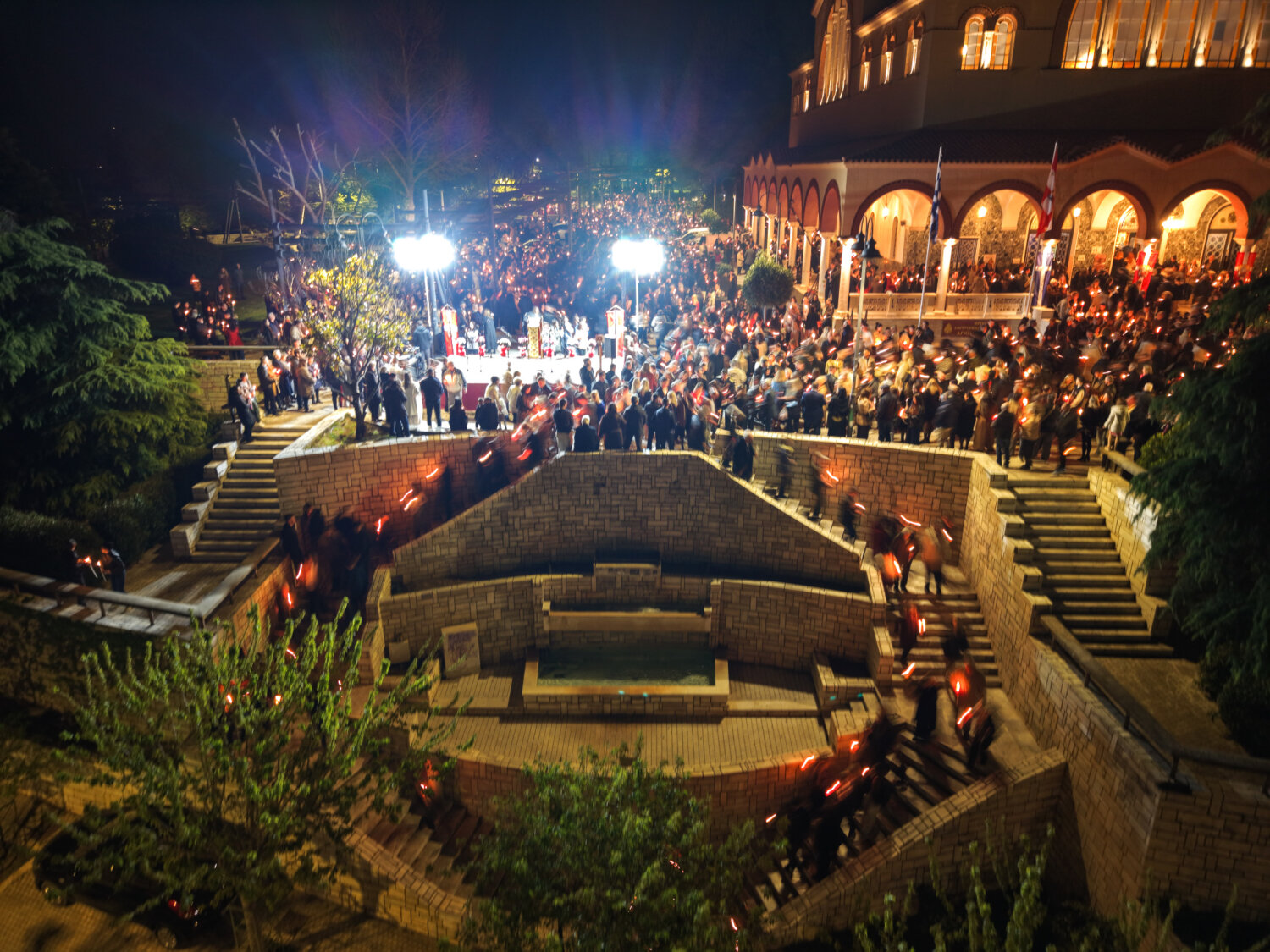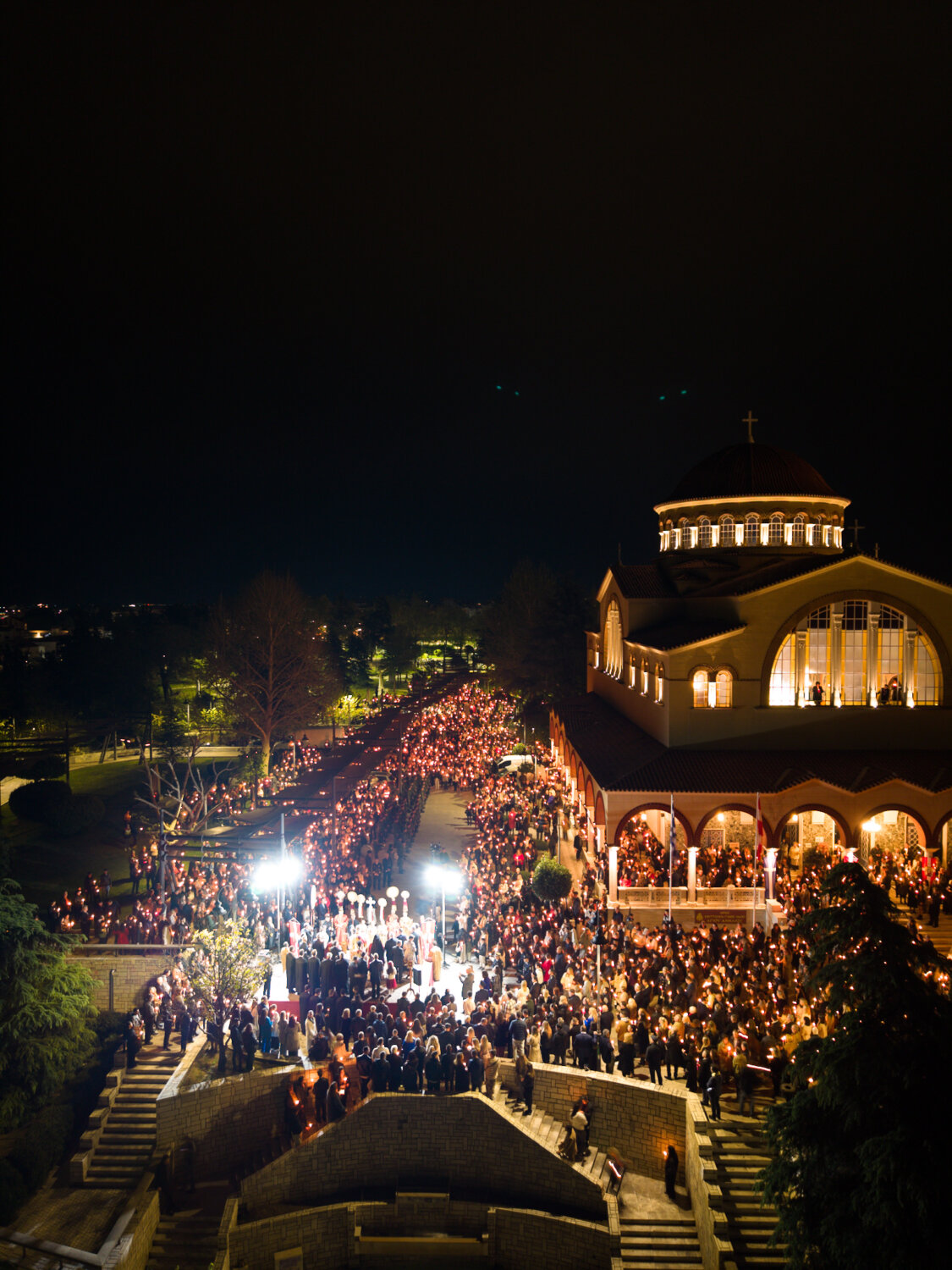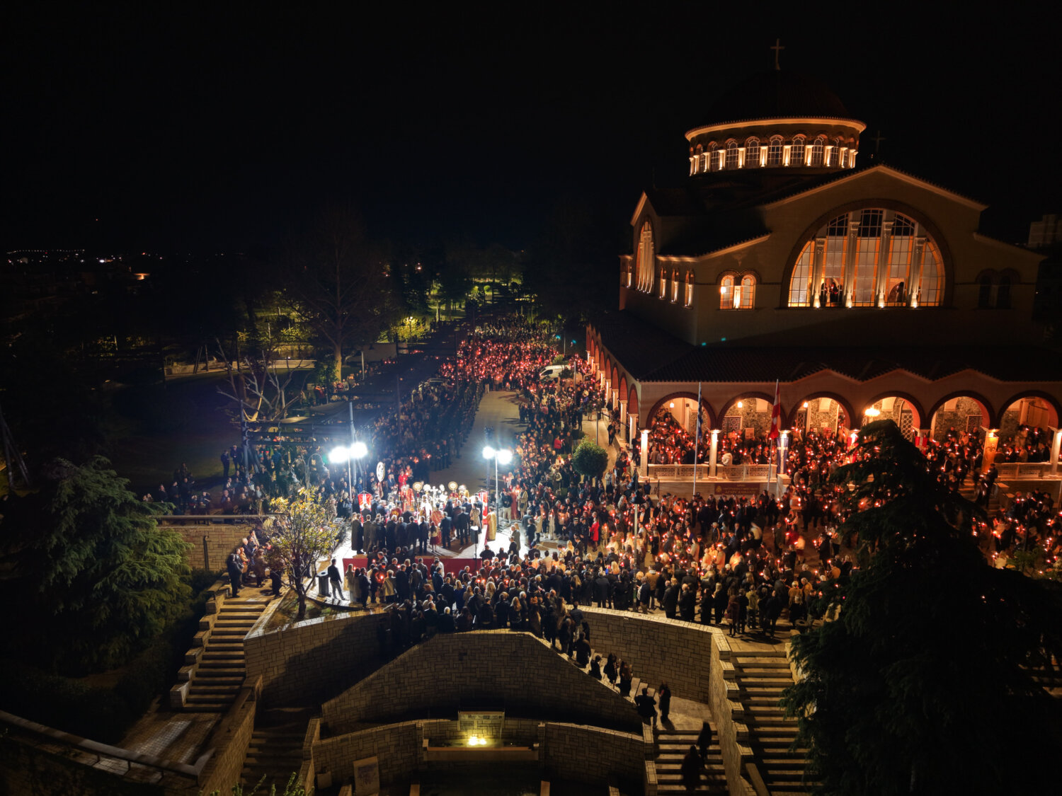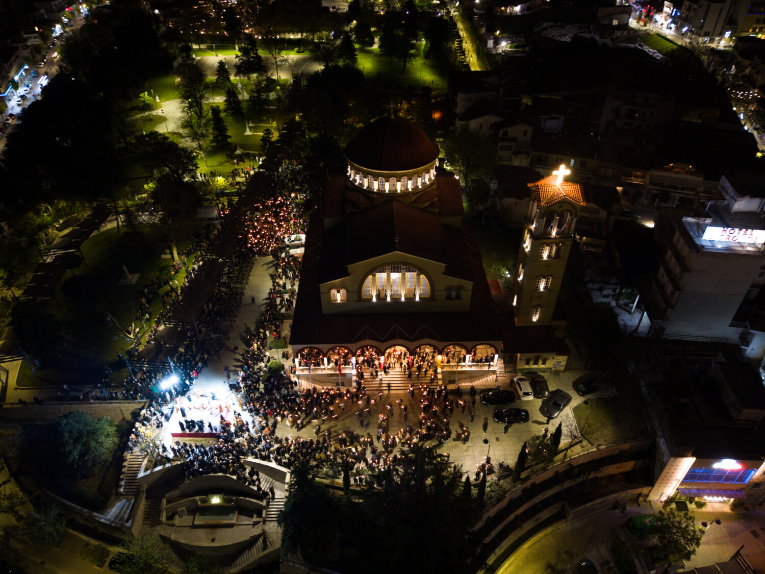 Από ψηλά, η στιγμή της Ανάστασης στον Ιερό Ναό Αγίου Αχιλλίου αποκαλύπτεται με μια διαφορετική ματιά. Φως, κατάνυξη και πλήθος κόσμου ενώνονται σε ένα μοναδικό νυχτερινό σκηνικό στην καρδιά της Λάρισας. Δείτε τις εντυπωσιακές εικόνες μέσα από drone: