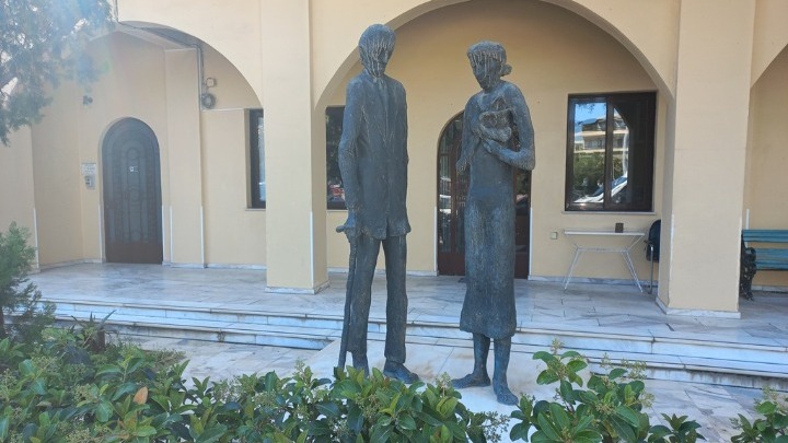 *ΦΩΤΟ: Το γλυπτό, που είναι δημιούργημα και δωρεά το 1986 του γλύπτη Κώστα Βαλσάμη, βρίσκεται στην είσοδο της δομής ηλικιωμένων «Σπιτικό της Αγάπης» στο Μοσχάτο.