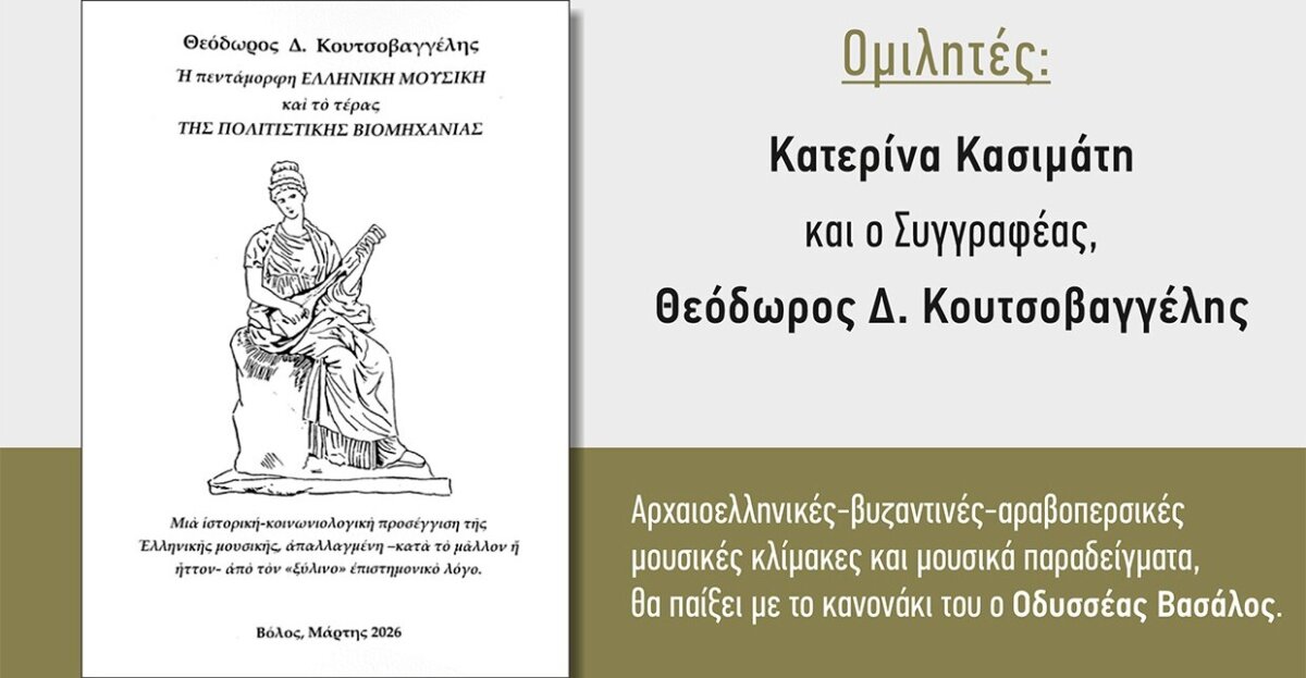 Την Τετάρτη 15 Απριλίου και ώρα 19:30 θα πραγματοποιηθεί στον πολιτιστικό χώρο «Θεατρίνη» (Πλάτωνος 20, Βόλος) η παρουσίαση του νέου βιβλίου του Προμυριώτη φιλόλογου, μουσικοσυνθέτη και ερευνητή-συγγραφέα Θεοδώρου Δ. Κουτσοβαγγέλη. Το έργο φέρει τον τίτλο «Η ΠΕΝΤΑΜΟΡΦΗ ΕΛΛΗΝΙΚΗ ΜΟΥΣΙΚΗ ΚΑΙ ΤΟ ΤΕΡΑΣ ΤΗΣ ΠΟΛΙΤΙΣΤΙΚΗΣ ΒΙΟΜΗΧΑΝΙΑΣ».