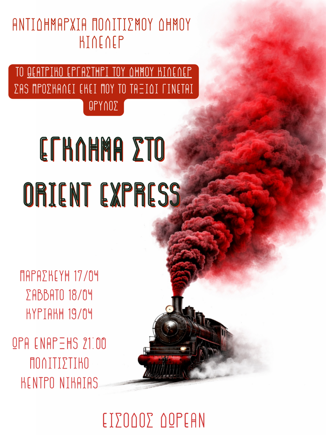 Έναρξη φέτος των θεατρικών δράσεων του Εργαστηρίου γίνεται με ένα από τα πιο εμβληματικά έργα της Agatha Christie, “Έγκλημα στο Οριάν Εξπρές”. Παραστάσεις Παρασκευή 17 , Σάββατο 18 και Κυριακή 19 Απριλίου 2025 και ώρα 21.00, στο Πολιτιστικό Κέντρο Νίκαιας με δωρεάν είσοδο.