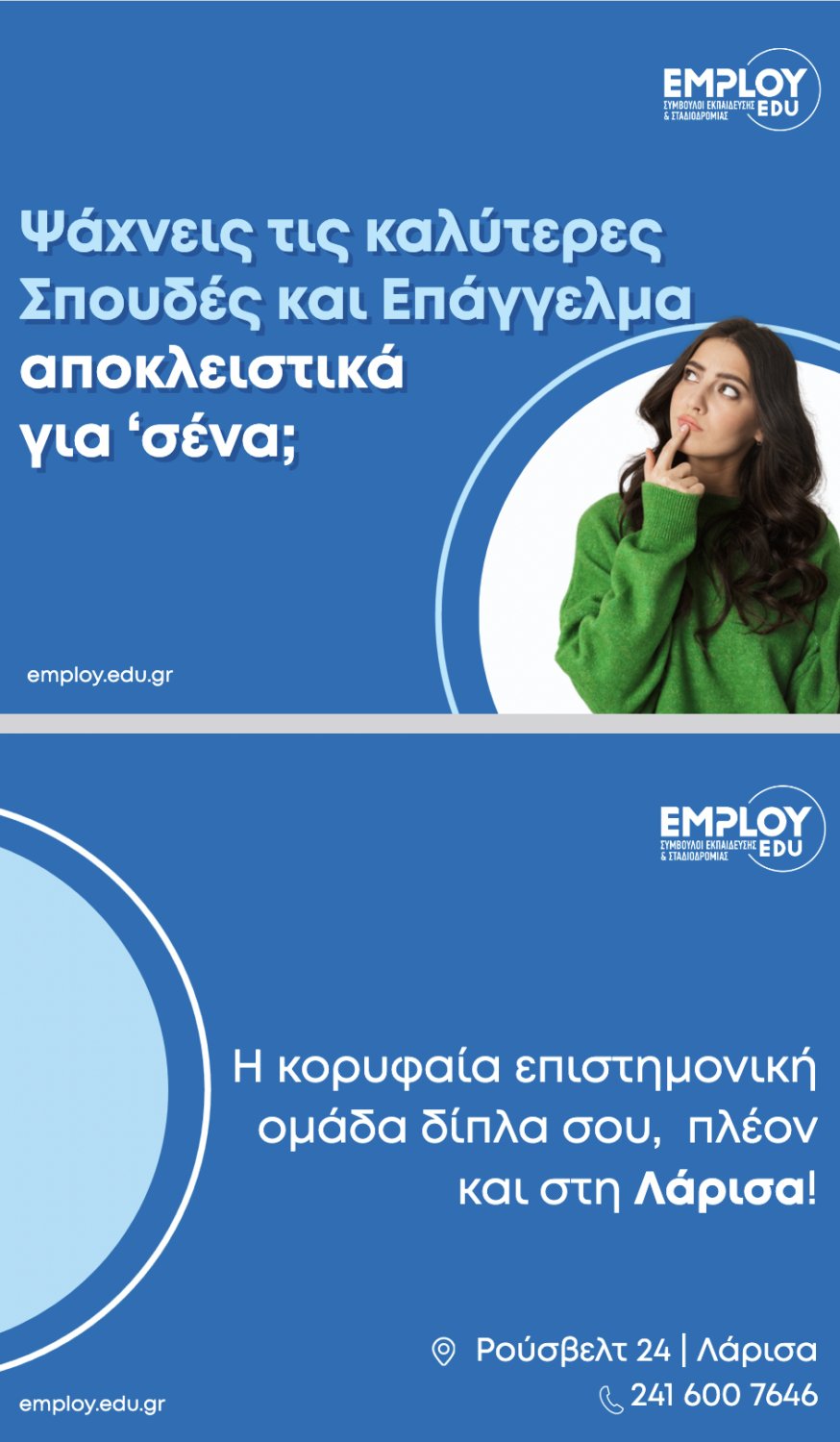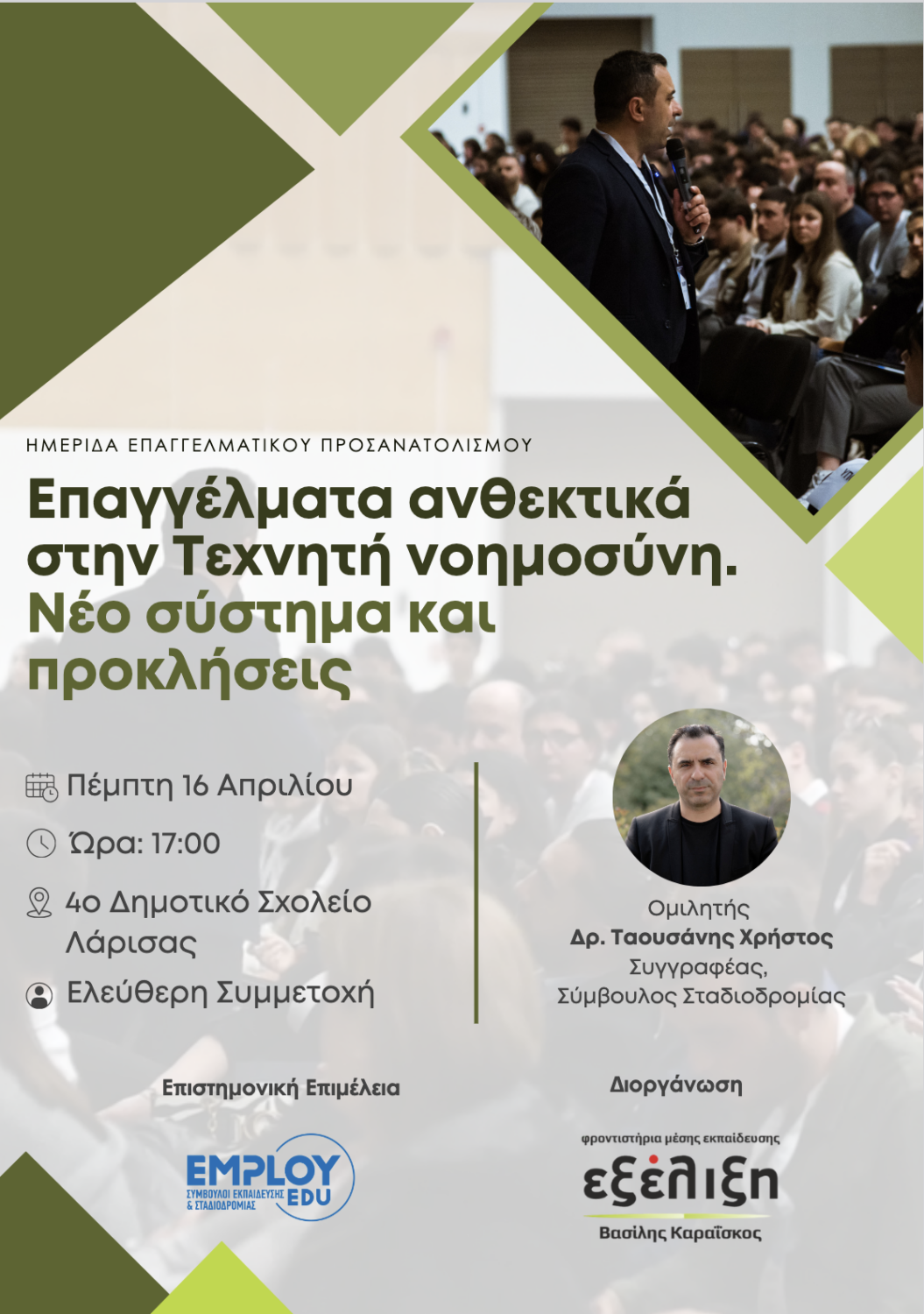 Η EMPLOY EDU Σύμβουλοι Εκπαίδευσης και Σταδιοδρομίας, σε συνεργασία με τα φροντιστήρια ΕΞΕΛΙΞΗ και τον κ. Βασίλη Καραΐσκο, σας προσκαλεί σε μια ιδιαίτερα επίκαιρη και χρήσιμη εκδήλωση ενημέρωσης και διαλόγου με τίτλο: