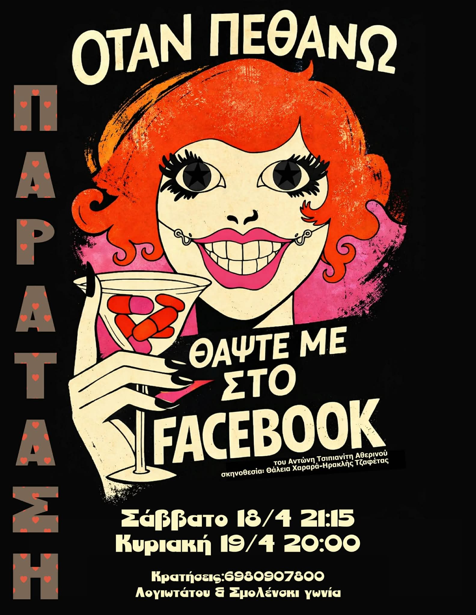 Όταν Πεθάνω Θάψτε με στο FACEBOOΚ του Αντώνη Τσιπιανίτη-Αθερινού σε σκηνοθεσία Ηρακλή Τζαφέτα και Θάλειας Χαραρά για ΔΥΟ ακόμα παραστάσεις!