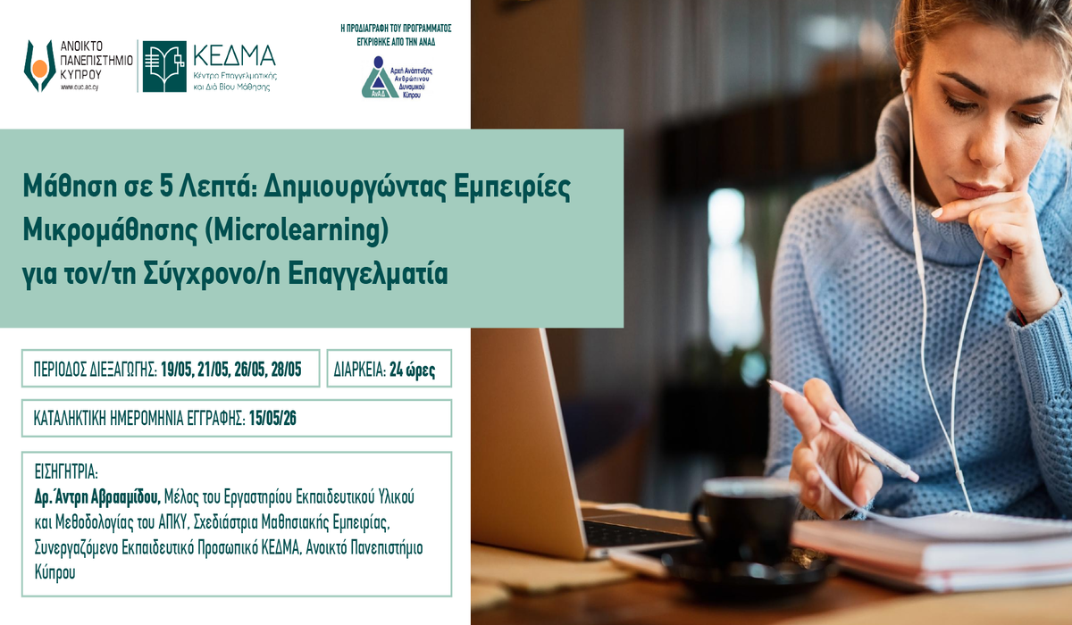 Το Κέντρο Επαγγελματικής και Διά Βίου Μάθησης (ΚΕΔΜΑ) του Ανοικτού Πανεπιστημίου Κύπρου (ΑΠΚΥ) διοργανώνει διαδικτυακό πρόγραμμα / σεμινάριο επιμόρφωσης με τίτλο «Μάθηση σε 5 λεπτά: Δημιουργώντας Εμπειρίες Μικρομάθησης (Microlearning) για τον/τη Σύγχρονο/η Επαγγελματία». Το Πρόγραμμα επιχορηγείται από την Αρχή Ανάπτυξης Ανθρώπινου Δυναμικού (ΑνΑΔ) της Κυπριακής Δημοκρατίας.