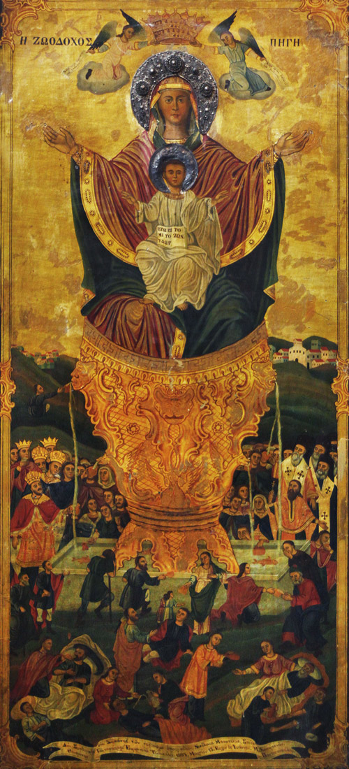 ΣΥΝΑΞΑΡΙ: Ένα από τα πολλά ονόματα της Θεοτόκου είναι και το “Ζωοδόχος Πηγή”, αφού γέννησε την Ζωή, που είναι ο Χριστός. Το όνομα αυτό αποδόθηκε στην Παναγία από τον Ιωσήφ τον Υμνογράφο (9ος αι.). Η γιορτή αναφέρεται στα εγκαίνια του Ναού της Παναγίας, γνωστού ως «Ζωοδόχος Πηγή στο Μπαλουκλί», έξω από τα θεοδοσιανά τείχη της Κωνσταντινούπολης, όπου και τα λεγόμενα «παλάτια των πηγών», θέρετρα Βυζαντινών Αυτοκρατόρων. Εκεί υπήρχε αγίασμα που επιτελούσε και επιτελεί πολλά θαύματα.