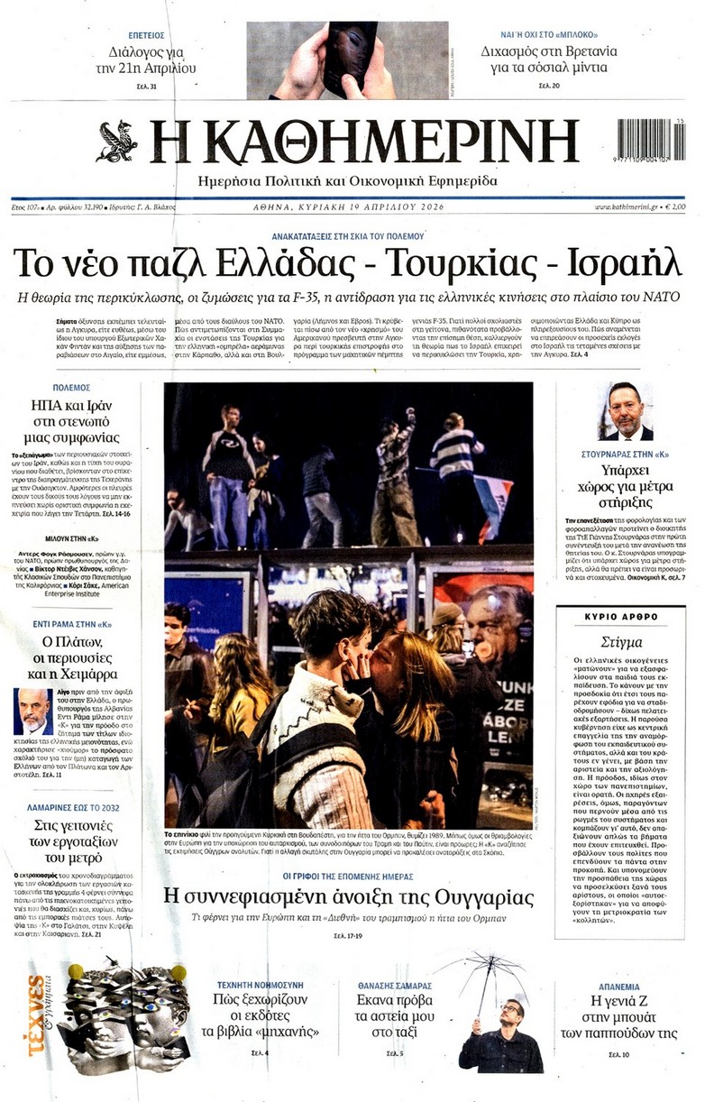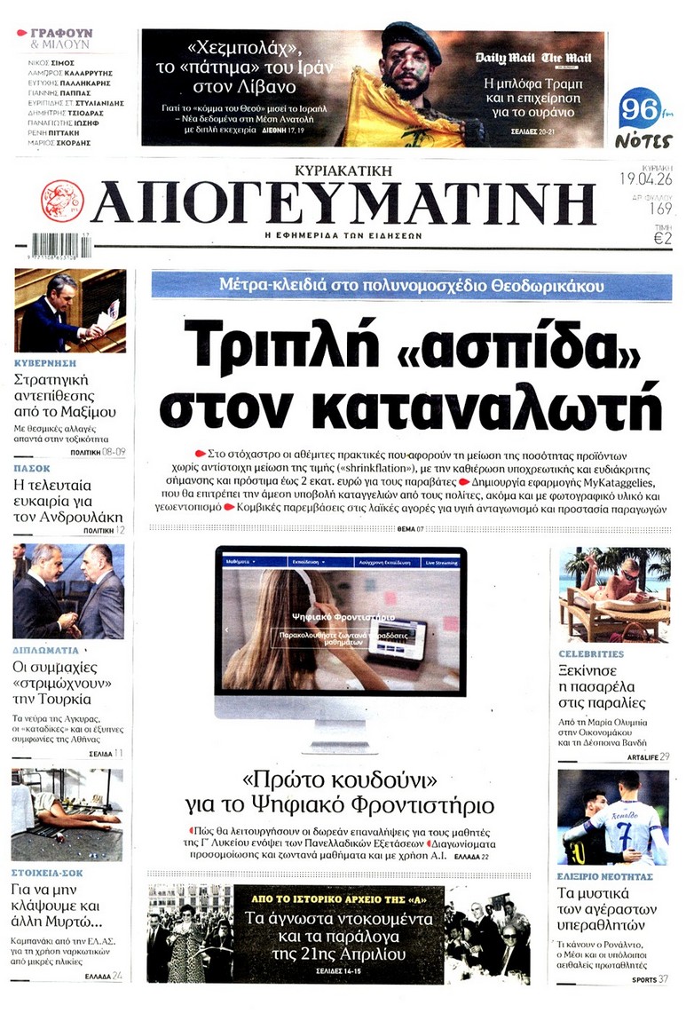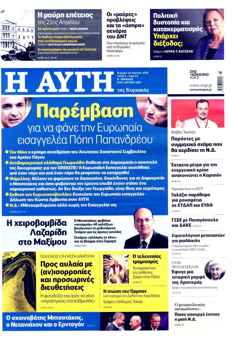 Το παζλ ανάμεσα σε Ελλάδα-Τουρκία-Ισραήλ με τις ανακατατάξεις που φέρνει ο πόλεμος, το «κλειδί» για τα Στενά του Ορμούζ και τα σενάρια για την οικονομία, το νέο πακέτο των έκτακτων μέτρων στήριξης, αλλά και το σχέδιο για τον νέο εκλογικό νόμο κυριαρχούν στα πρωτοσέλιδα των κυριακάτικων εφημερίδων.