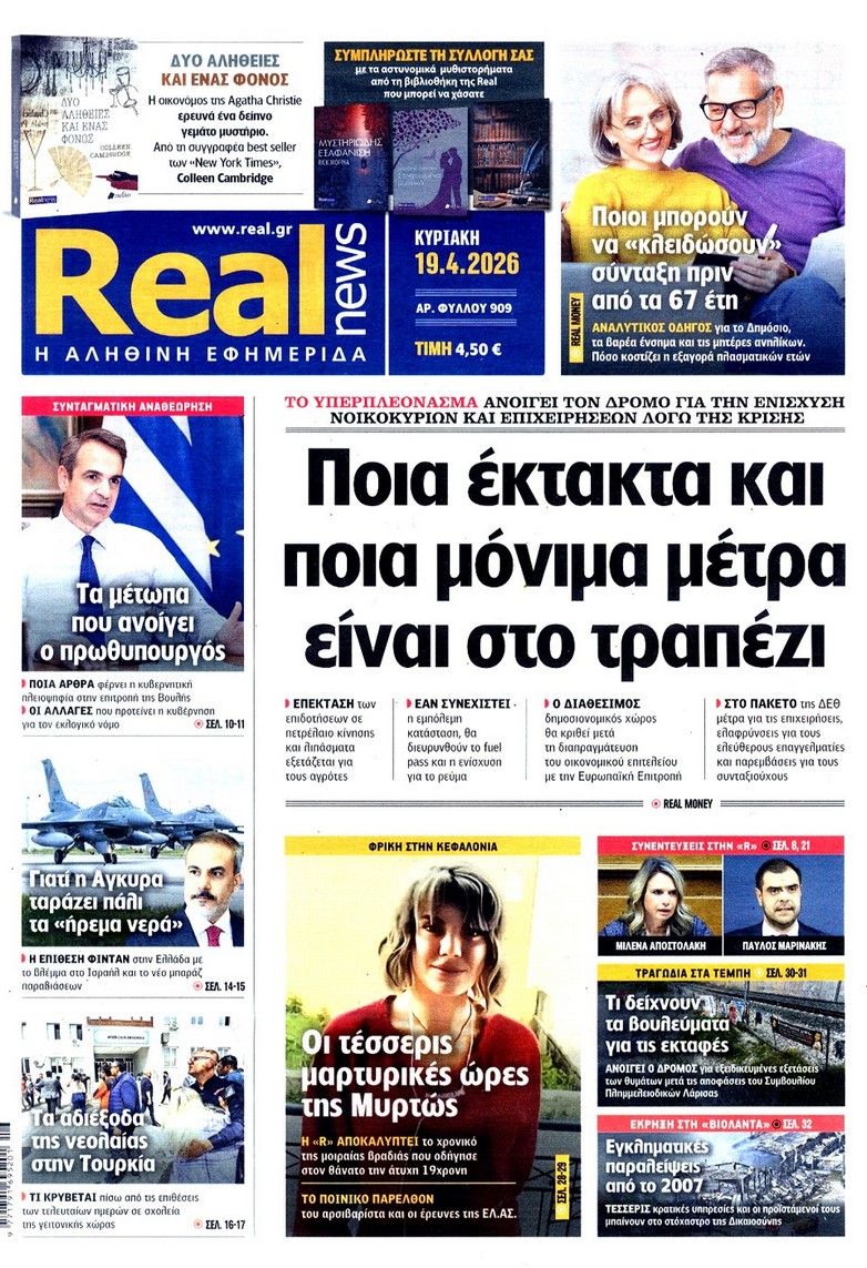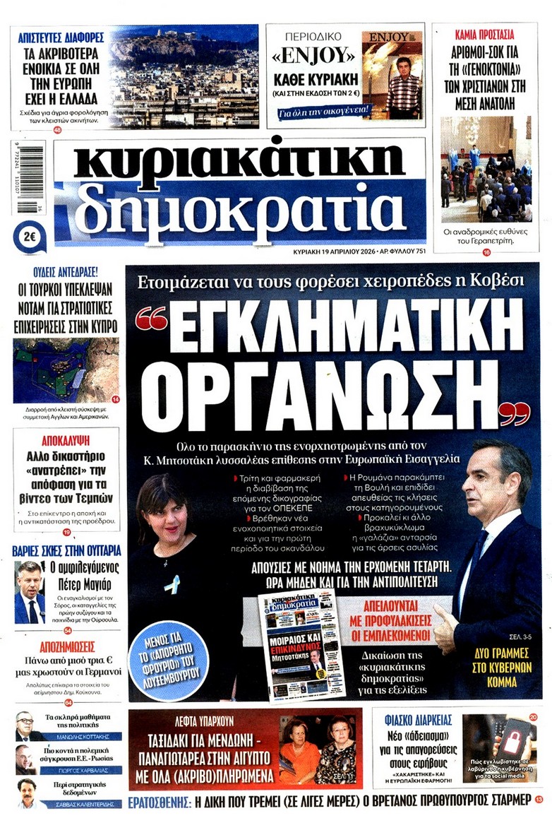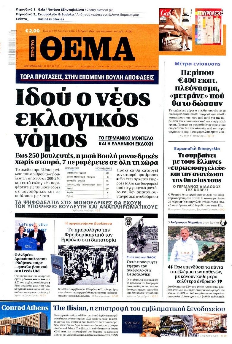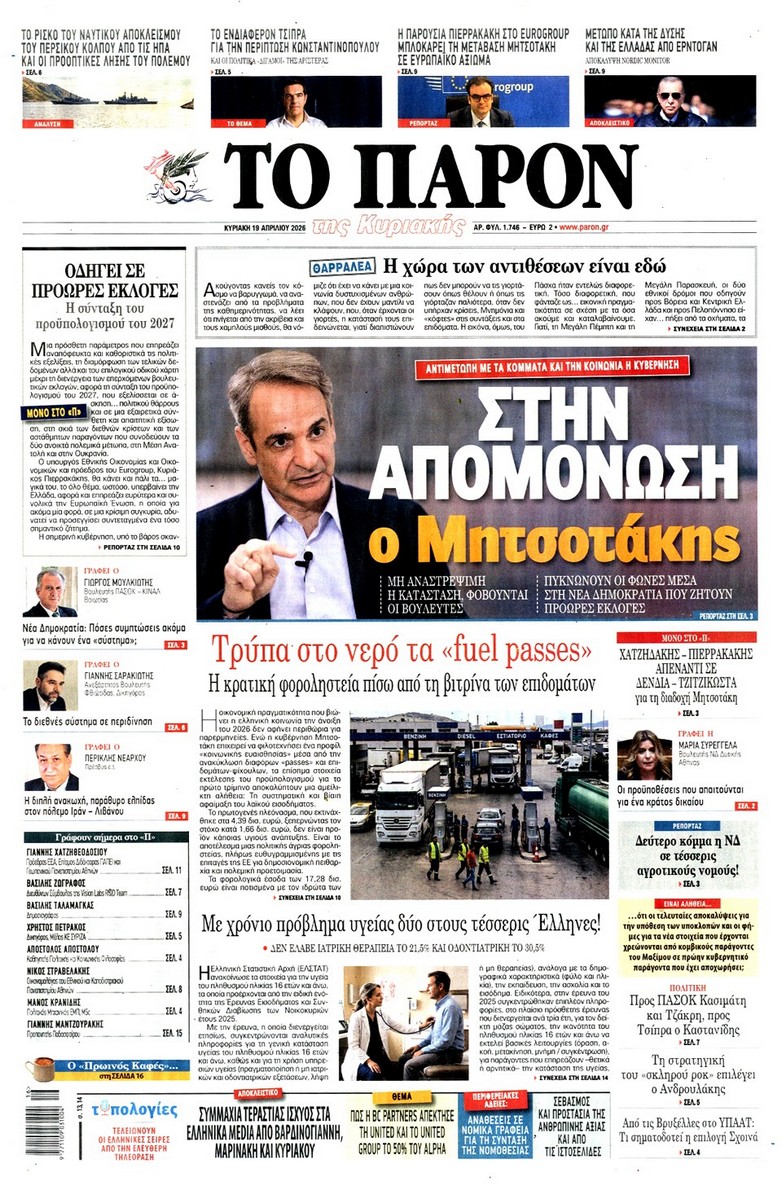 Το παζλ ανάμεσα σε Ελλάδα-Τουρκία-Ισραήλ με τις ανακατατάξεις που φέρνει ο πόλεμος, το «κλειδί» για τα Στενά του Ορμούζ και τα σενάρια για την οικονομία, το νέο πακέτο των έκτακτων μέτρων στήριξης, αλλά και το σχέδιο για τον νέο εκλογικό νόμο κυριαρχούν στα πρωτοσέλιδα των κυριακάτικων εφημερίδων.