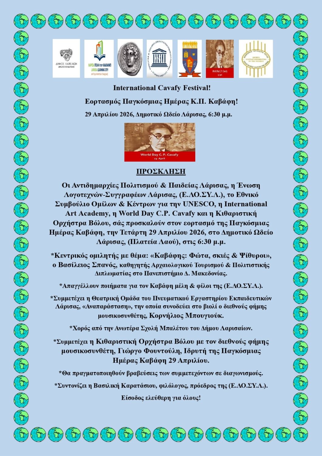 Συμμετέχει η Κιθαριστική Ορχήστρα του Βόλου με μουσικοσυνθέτη, τον Yorgos Foudoulis, Ιδρυτή της Παγκόσμιας Ημέρας Καβάφη 29 Απριλίου!