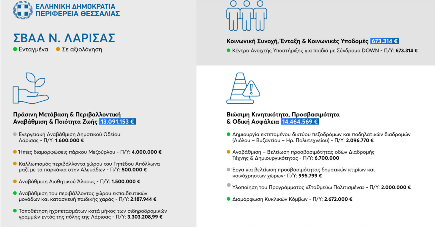 Η Στρατηγική Βιώσιμης Ανάπτυξης (ΣΒΑΑ) του Δήμου Λαρισαίων προϋπολογισμού 44.349.162€ εγκρίθηκε με την με αρ. 4301-12/07/2024 Απόφαση Περιφερειάρχη Θεσσαλίας. Η περιοχή παρέμβασης καλύπτει το σύνολο της λειτουργικής αστικής περιοχής της Λάρισας, έκτασης 20,26 km² και πληθυσμού 146.595 κατοίκων (2021). Περιλαμβάνει έργα που αφορούν στους τομείς που αποτυπώνονται στους πίνακες που ακολουθούν: