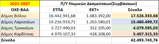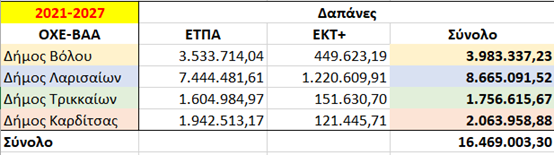 Ο συνολικός προϋπολογισμός των ΣΒΑΑ των 4 πρωτευουσών των ΠΕ Θεσσαλίας για το ΠΕΠ «Θεσσαλία» 2021-2027 αγγίζει τα 120 εκ. ευρώ, ποσό το οποίο αντιστοιχεί σε ποσοστό πάνω από το 17% των πόρων του ΕΤΠΑ. Συγκεκριμένα, οι προϋπολογισμοί ανά πρωτεύουσα ΠΕ αναλύονται σε 44,35 εκ. € για τη Λάρισα, 32,73 εκ. € για το Βόλο, 22,82 εκ. € για τα Τρίκαλα και 19,88 εκ. € για την Καρδίτσα.
