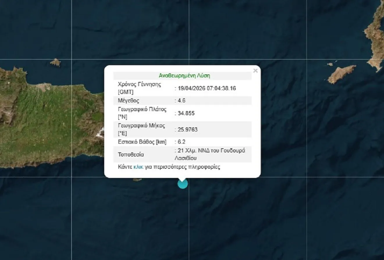 Ισχυρός σεισμός μεγέθους 4,6 βαθμών της κλίμακας Ρίχτερ σημειώθηκε το πρωί της Κυριακής (19/4) στην Κρήτη, ανοιχτά του Λασιθίου.