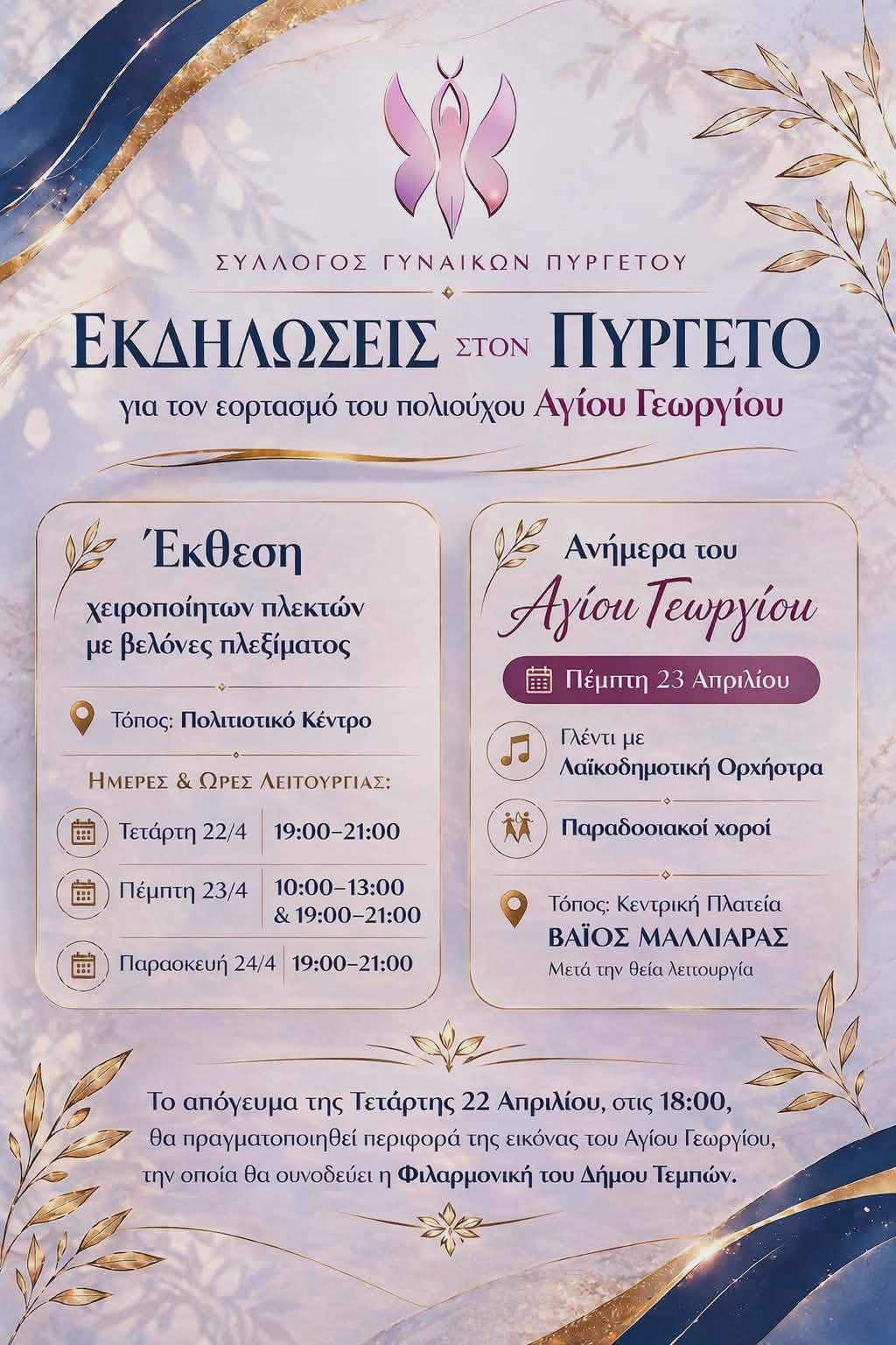 Εκδηλώσεις θα πραγματοποιηθούν στον Πυργετό του Δήμου Τεμπών για την εορτή του Πολιούχου Αγίου Γεωργίου: