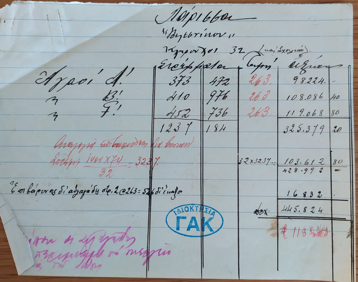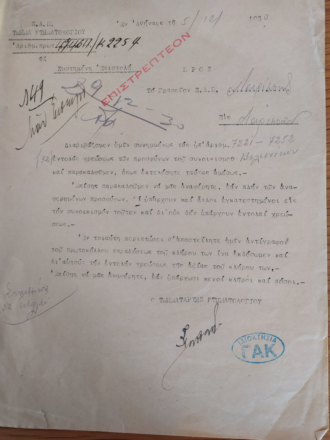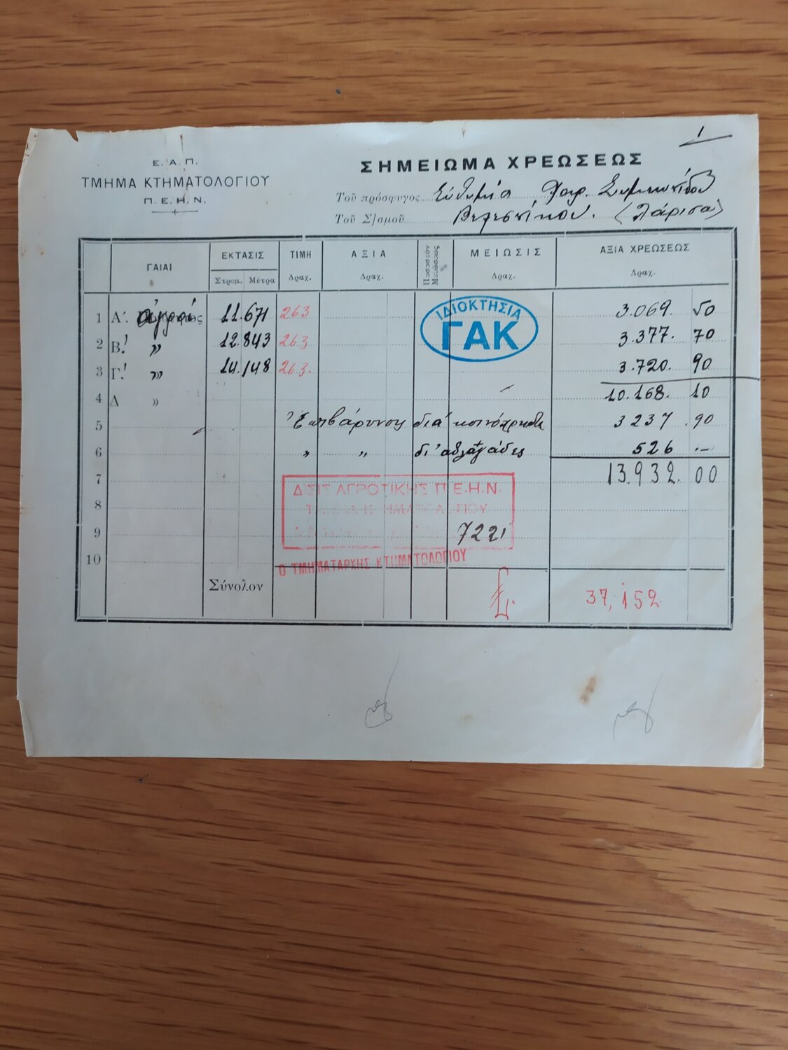 - Χρεωστικό Σημείωμα Κτηματολογίου της ΕΑΠ (5-12-1930):