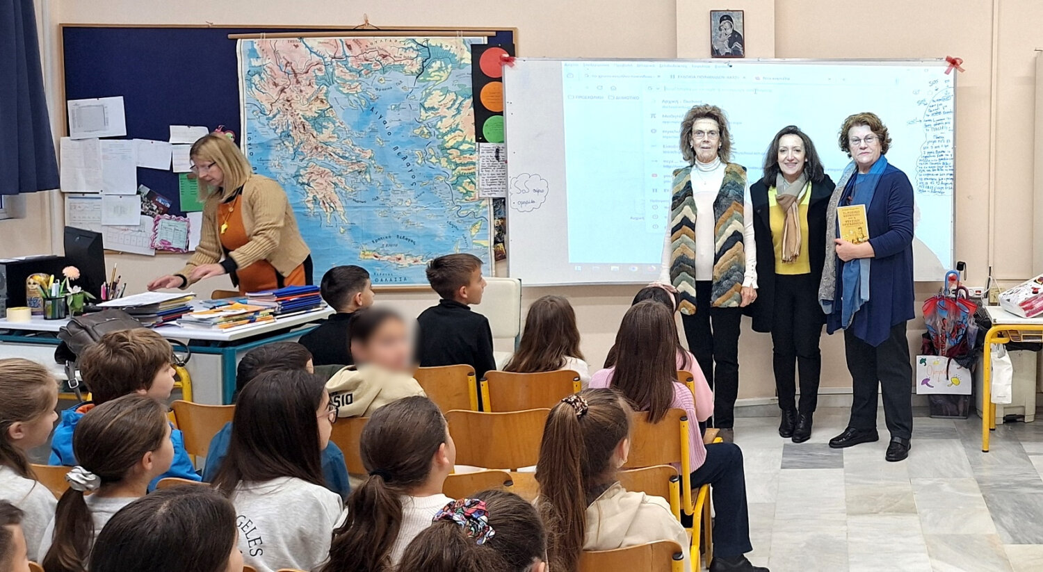 Τις τάξεις Γ1 και Γ2 τάξεις, των εκπαιδευτικών Μαστορογιάννη Καίτης και Τσιρώνη Φιλιώς επισκέφτηκε η ποιήτρια και συγγραφέας παιδικών βιβλίων Ελένη Χριστούλα – Πατελοδήμου (μέλος της Γυναικείας Λογοτεχνικής Συντροφιάς και του ΠΟΚΕΛ) και η επίσκεψή της αποτέλεσε μια ξεχωριστή και δημιουργική εμπειρία για τους μαθητές. Η συγγραφέας ξεκίνησε την παρουσίαση με μια σύντομη κι ενδιαφέρουσα αναφορά στον παραμυθά Χανς Κρίστιαν Άντερσεν, ταξιδεύοντας τα παιδιά στον μαγικό κόσμο των παραμυθιών και της φαντασίας. Στη συνέχεια, διάβασε επιλεγμένα ποιήματά της, δίνοντας την ευκαιρία στα παιδιά να έρθουν σε άμεση και βιωματική επαφή με τον ποιητικό λόγο. Οι μαθητές άκουσαν με προσοχή, συμμετείχαν ενεργά και μοιράστηκαν σκέψεις και συναισθήματα που τους γεννήθηκαν μέσα από τους στίχους, ενώ με την καθοδήγηση της συγγραφέως, τα παιδιά συνεργάστηκαν δημιουργικά και συνέθεσαν το δικό τους ομαδικό ποίημα, το οποίο κατέγραψαν με ενθουσιασμό στα τετράδιά τους. Η δραστηριότητα αυτή ενίσχυσε τη φαντασία, την έκφραση και τη συνεργασία μεταξύ τους, ενώ ολοκληρώθηκε με τη διανομή φύλλων εργασίας, μέσα από τα οποία οι μαθητές κλήθηκαν να πειραματιστούν με τους στίχους, να κάνουν τις δικές τους αλλαγές και να «ζωντανέψουν» τα ποιήματα, μέσα από την παντομίμα.