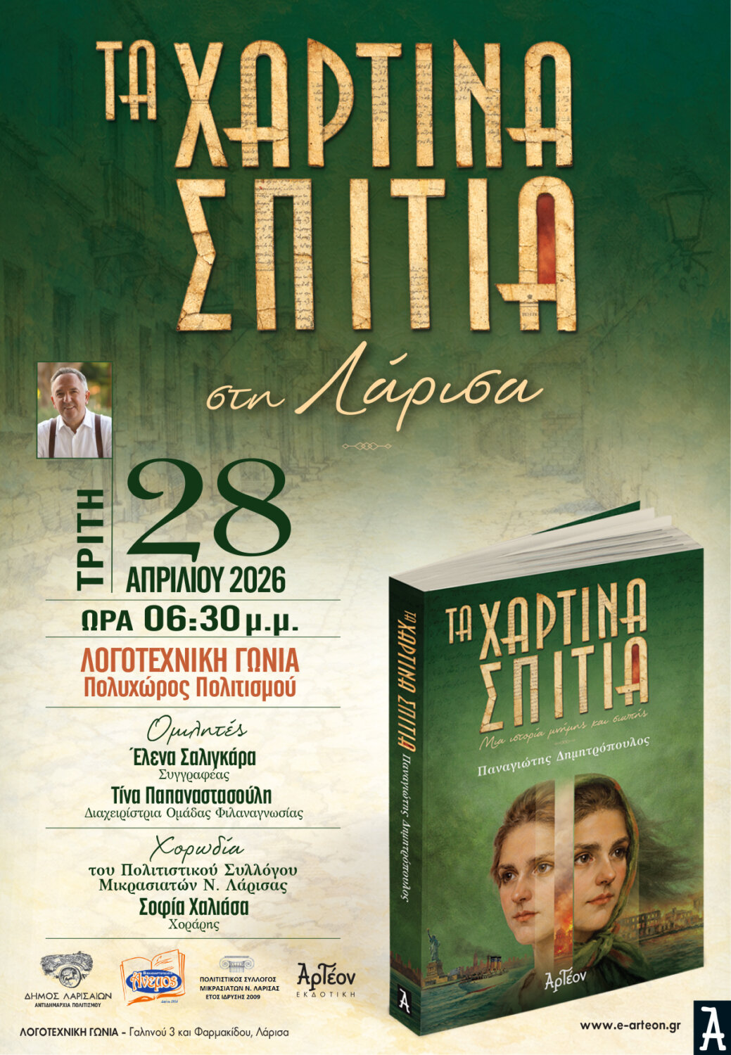 Το νέο βιβλίο του Παναγιώτη Δημητρόπουλου με τίτλο “Τα χάρτινα σπίτια”, παρουσιάζουν η Αντιδημαρχία Πολιτισμού του Δήμου Λάρισας, το Βιβλιοπωλείο Άνεμος, ο Σύλλογος Μικρασιατών Νομού Λάρισας και η Αρτέον Εκδοτική, την Τρίτη 28 Απριλίου 2026 και ώρα: 18:30 στην Λογοτεχνική Γωνία (Γαληνού & Φαρμακίδου) στη Λάρισα.